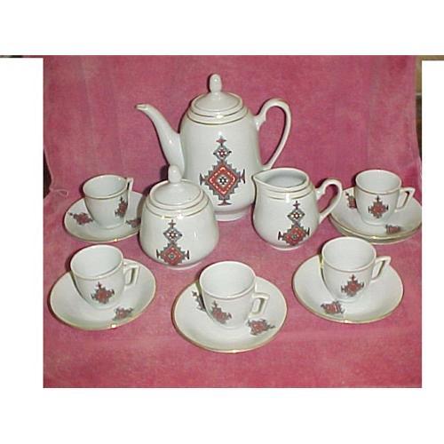 Saucers are 4-3/4" & cups are 2-1/8" tall. teapot is 8" counting the lid. Includes: 5 cups & 6 saucers, creamer, sugar & lid, teapot & lid. Marked on the bottom Looks sort of like a G with oriental writing around it. All good condition with no damage.