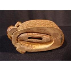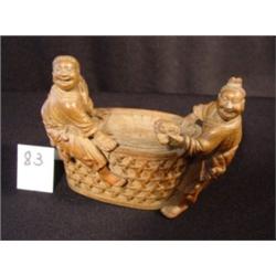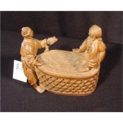 5" by 6" by 3", Oriental wood carving of merchant couple selling something on a slab, sitting on large basket laughing. Very nice detail.