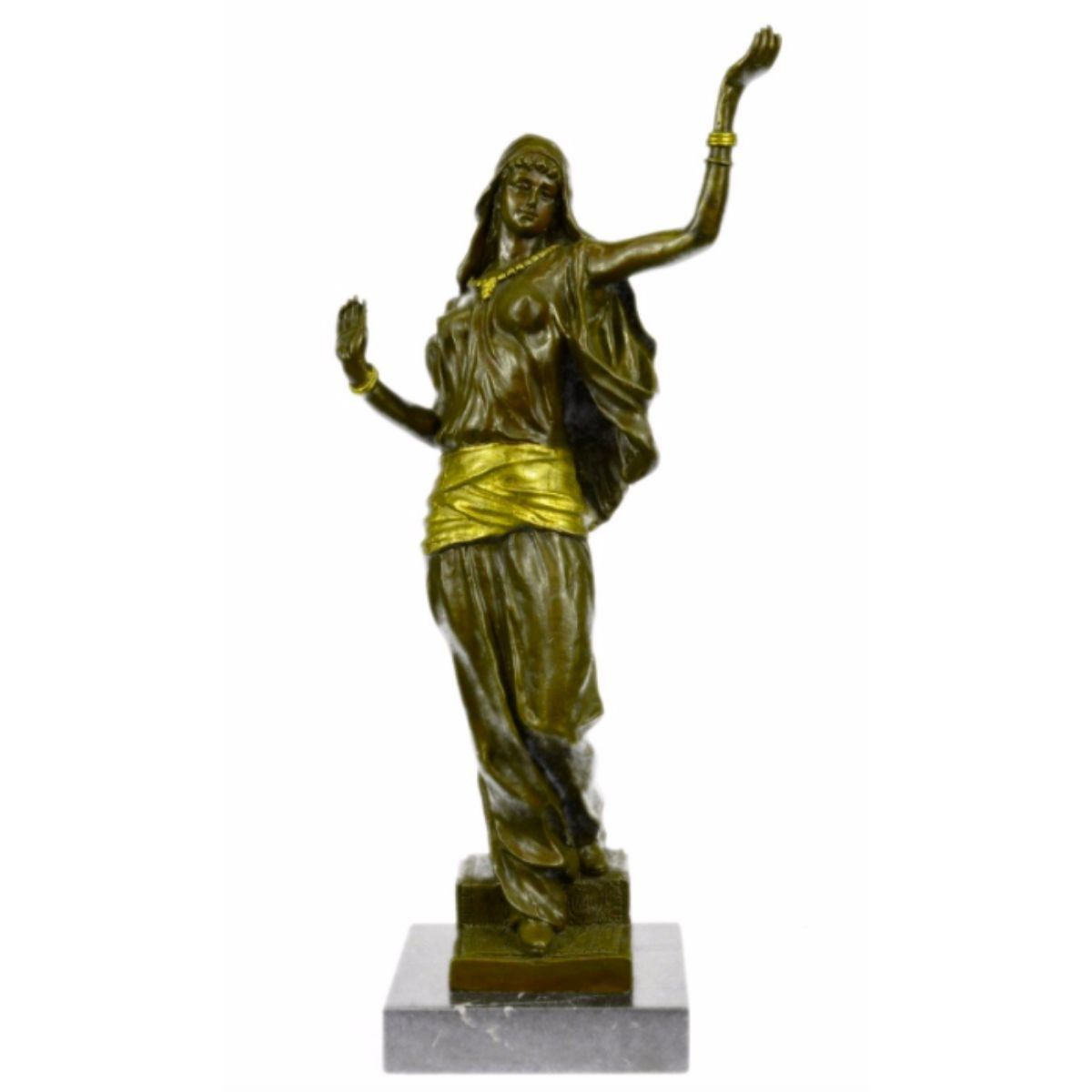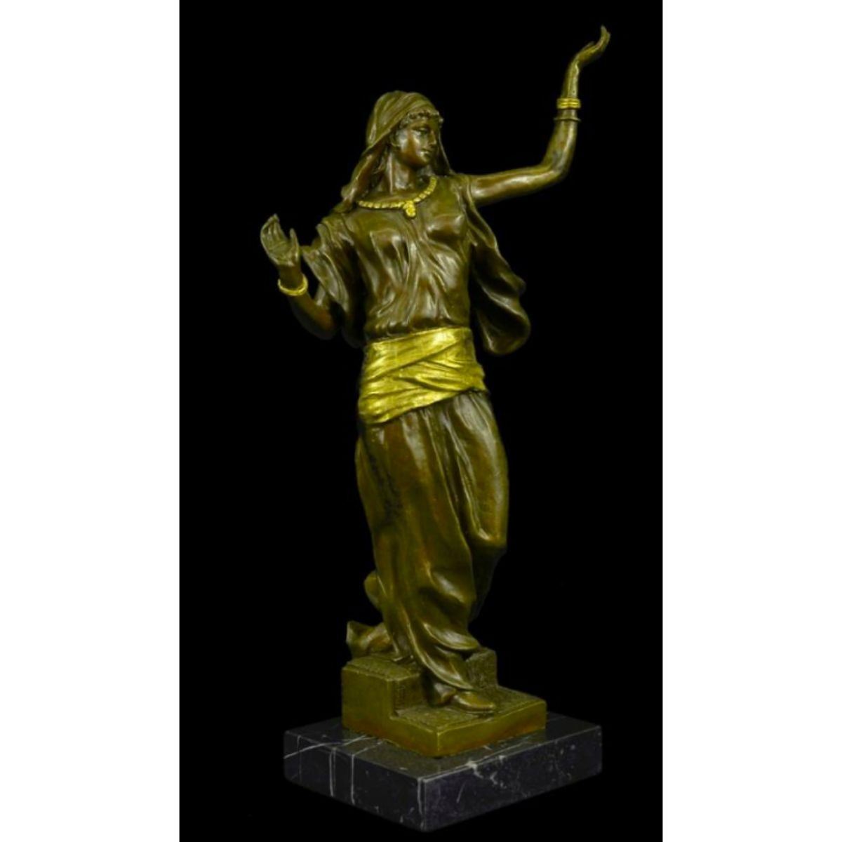 In the style of the Orientalists, exotic dancing girl sculpture. Lost wax casting method bronze, with gilt & brown patina, mounted on marble. 16" H X 9" W. 10 lbs.Â