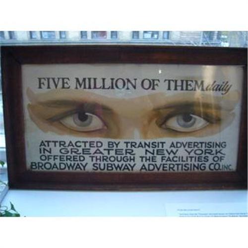 "Attracted by transit advertising in greater New York offered through the facilities of Broadway Subway Advertising Co. Inc.," A bold, simple, color design of eyes rendered to follow you around the room. Scarce and early promotion for trolley card advertising.