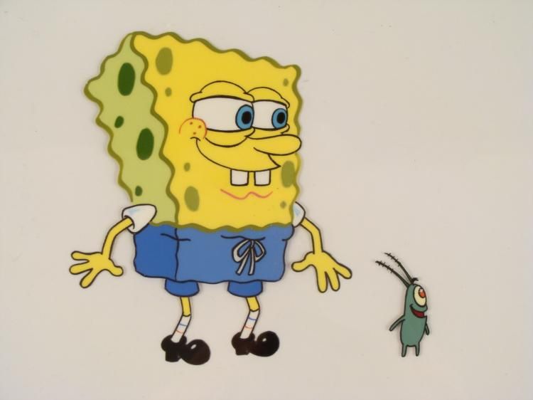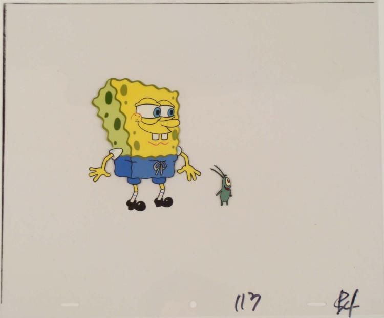 This original animation cel is from the Nickelodeon TV show SpongeBob Squarepants. The story takes place under the deep blue sea in Bikini Bottom, where SpongeBob resides. SpongeBob, who is a yellow, porous sponge, is your typical happy-go-lucky character, as he is always cheerful and enjoys making people laugh. Patrick Star, SpongeBob's neighbor who is a starfish, boasts knowing nothing and is often getting himself into ridiculous situations. Between the homes of these two lies the home of the miserable Squidward, a squid, who is known for being grouchy and playing tricks on SpongeBob and Patrick. Both SpongeBob and Squidward work at the Krusty Krab, a fast food business run by the greedy money-loving Mr. Krabs, a crab, the arch rival of the evil, possibly misunderstood, Plankton. Another neighbor, Sandy Cheeks, an athletic squirrel who normally wears an astronaut's space suit, was introduced in "Tea at the Treedome." She spends most of her time inventing and experimenting. * With SpongeBob poised and ready to go, Plankton is set to dominate the world! * Original Production Animated Cel Overall Size of Cel: 10 1/2" x 12 1/2" Very Good Condition (slight fading to outlines)This is an original hand-painted cel set-up used in the production of an episode of "SpongeBob SquarePants." Each one-of-a-kind set-up represents a slight change in position of the characters. When individually photographed and projected in rapid succession, the images appear to move. * To create production cels, the original animator's drawing is transferred onto an acetate cel (by hand-inking and/or photo copying). The cel is then hand-painted on the reverse side. * This is a double layer cel, with each character on a separate sheet. Peg holes and animator's notations are at the bottom of the cel. *