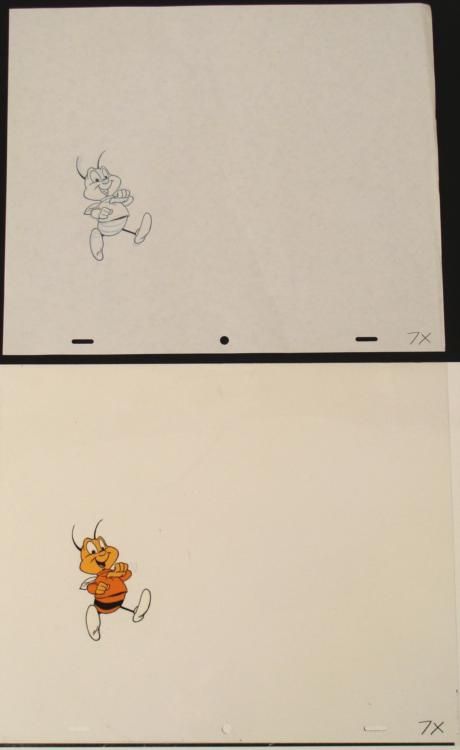 Buzz is my main bee . This original animation cel & drawing are from the production of the Honey Nut Cheerios cereal commercial. * * * Original Animation Cel & DrawingMedium: Hand painted acetate celDetails: Animation notations and peg holes * * Original "rough" animation drawing, in non-photo blue and black pencil * * Size of cel: 10 1/2 x 12 1/2 inchesSize of drawing: 10 1/2 x 12 1/2 inches * * Condition: Very good * This is an original hand-painted cel set-up used in the production of the "Honey Nut Cheerios commercial." Each one-of-a-kind set-up represents a slight change in position of the characters. When individually photographed and projected in rapid succession, * the images appear to move. To created production cels, the original animator's drawing is transferred onto an acetate cel (by hand-inking and/or photo copying). The cel is then hand-painted on the reverse side. * * * * Traditional animation is a multi-step process which includes various types of art techniques. Drawings are a key part of the process, in which the animator creates the design and movement of the characters. Drawings are then transferred onto acetate cels * (by hand-inking and/or photo copying) to create a production cel, which is then hand painted on the back side, using paint colors chosen and approved by the creator of the series.