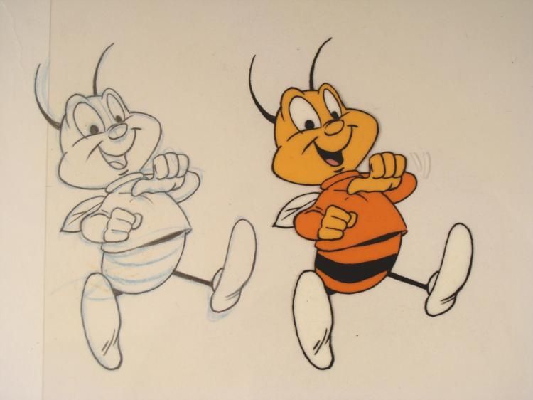 Buzz is my main bee . This original animation cel & drawing are from the production of the Honey Nut Cheerios cereal commercial. * * * Original Animation Cel & DrawingMedium: Hand painted acetate celDetails: Animation notations and peg holes * * Original "rough" animation drawing, in non-photo blue and black pencil * * Size of cel: 10 1/2 x 12 1/2 inchesSize of drawing: 10 1/2 x 12 1/2 inches * * Condition: Very good * This is an original hand-painted cel set-up used in the production of the "Honey Nut Cheerios commercial." Each one-of-a-kind set-up represents a slight change in position of the characters. When individually photographed and projected in rapid succession, * the images appear to move. To created production cels, the original animator's drawing is transferred onto an acetate cel (by hand-inking and/or photo copying). The cel is then hand-painted on the reverse side. * * * * Traditional animation is a multi-step process which includes various types of art techniques. Drawings are a key part of the process, in which the animator creates the design and movement of the characters. Drawings are then transferred onto acetate cels * (by hand-inking and/or photo copying) to create a production cel, which is then hand painted on the back side, using paint colors chosen and approved by the creator of the series.