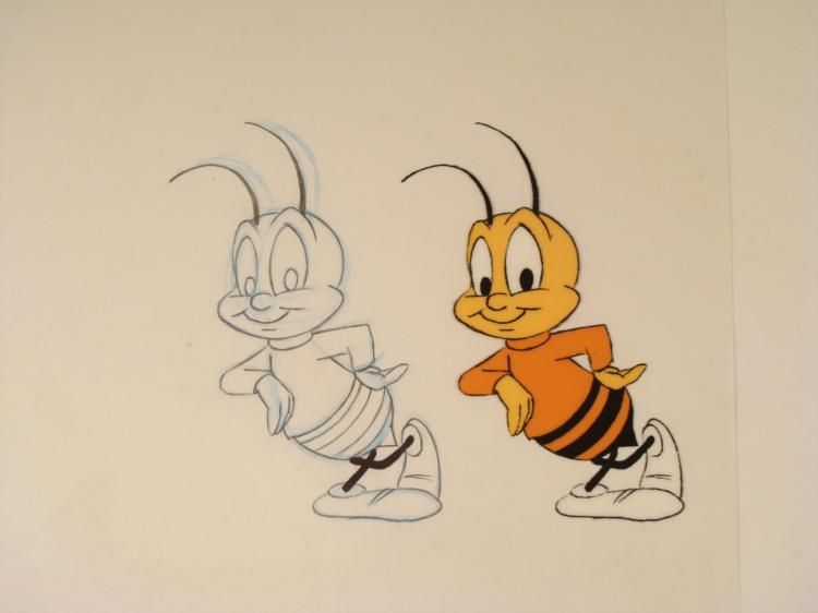 Just chillin! This original animation cel & drawing are from the production of the Honey Nut Cheerios cereal commercial. * * * Original Animation Cel & DrawingMedium: Hand painted acetate celDetails: Animation notations and peg holes * * Original "rough" animation drawing, in non-photo blue and black pencil * * Size of cel: 10 1/2 x 12 1/2 inchesSize of drawing: 10 1/2 x 12 1/2 inches * * Condition: Very good * This is an original hand-painted cel set-up used in the production of the "Honey Nut Cheerios commercial." Each one-of-a-kind set-up represents a slight change in position of the characters. When individually photographed and projected in rapid succession, * the images appear to move. To created production cels, the original animator's drawing is transferred onto an acetate cel (by hand-inking and/or photo copying). The cel is then hand-painted on the reverse side. * * * * Traditional animation is a multi-step process which includes various types of art techniques. Drawings are a key part of the process, in which the animator creates the design and movement of the characters. Drawings are then transferred onto acetate cels * (by hand-inking and/or photo copying) to create a production cel, which is then hand painted on the back side, using paint colors chosen and approved by the creator of the series.