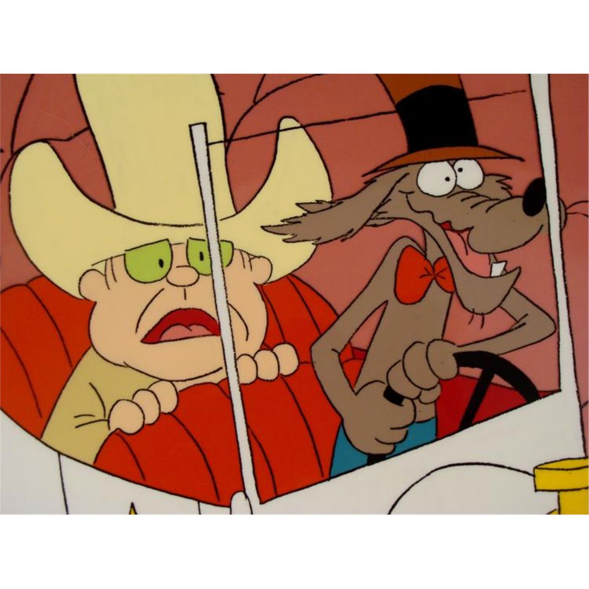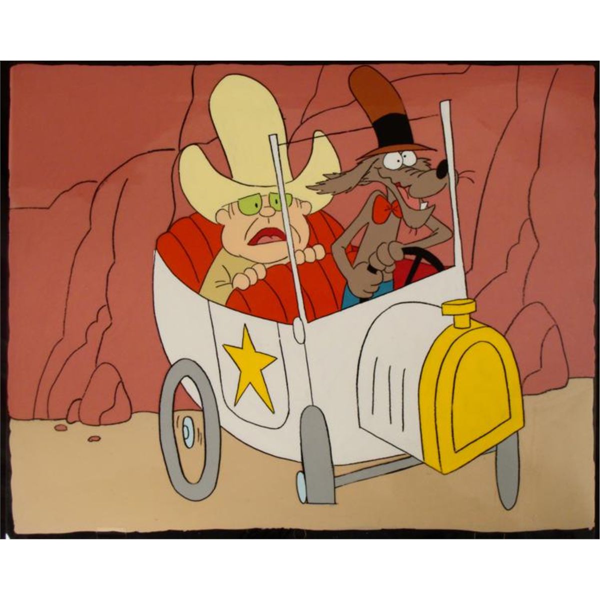 Here is an original animation cel and background used in the production of a Hoot Kloot cartoon, done at the studio of DePatie & Freleng. The program ran on television through the early 1970's. Here the Sheriff is being driven by a goofy looking dog. * * * Medium: Hand-inked and hand-painted acetate cel, and separate hand painted background on acetateSize: 12 1/2 x 10 1/4 inchesDetails: Peg holes and animator notations along the lower edge * Condition: Excellent