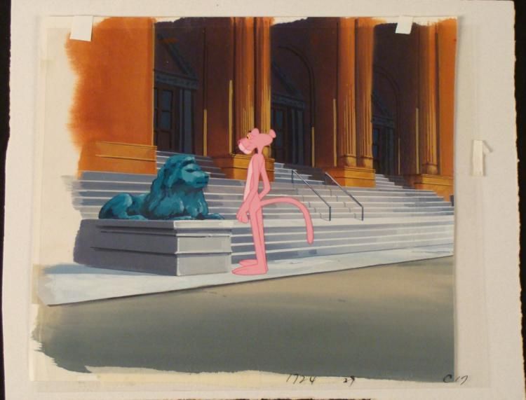 The Pink Panther is observing the lion statue. * * * Original Animation Cel & Production Background * * Medium: Hand painted acetate celDetails: Animation notations and peg holes * * Size of cel: 10 x 11 1/2 inchesSize of background: 10 x 11 inche