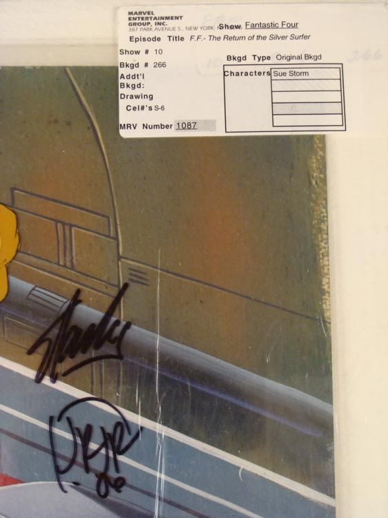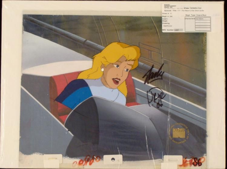 This is an original signed production cel and background from the hit series X-Men. Stan Lee signature & John Romita, Jr. (JR JR) signature is located on the right of cel in black sharpie. Under a cloud of increasing anti-mutant sentiment, Professor Xavier creates a haven at his Westchester mansion to train young mutants to use their powers for the benefit of humanity, and to prove mutants can be heroes. Xavier recruited Cyclops, Iceman, Angel, Beast and Jean Grey calling them "X-Men" because they possessed the "x-gene", an ability normal humans lacked. Early issues introduced the team's arch enemy, Magneto and his Brotherhood of Evil Mutants, who would later battle the X-Men for years. Where is Sue Storm? Original Animated Cel & Production Background Medium: Hand painted acetate cel Details: Animation notations and peg holes Overall Size of the Cel: 10 1/2" x 14" Overall Size of the background: 10 " x 12 1/4" Excellent Condition This is an original hand-painted cel set-up used in the production of an episode of X-Men titled "Dark Phoenix." Each one-of-a-kind set-up represents a slight change in position of the characters. When individually photographed and projected in rapid succession, the images appear to move. To create production cels, the original animator's drawing is transferred onto an acetate cel (by hand-inking and/or photo copying). The cel is then hand-painted on the reverse side. The background accompanying this set-up is an original production background. The cel and original background is ready to be matted and framed. The animators notations are located at the bottom of the cel and background. The Marvel Seal is located at the bottom right of the cel. The cel and background are in a protective sleeve. An information card about the episode is located at the top right of the protective sleeve.