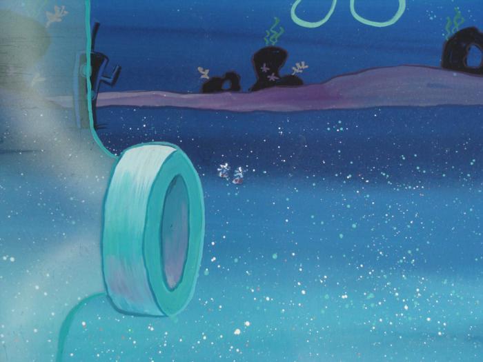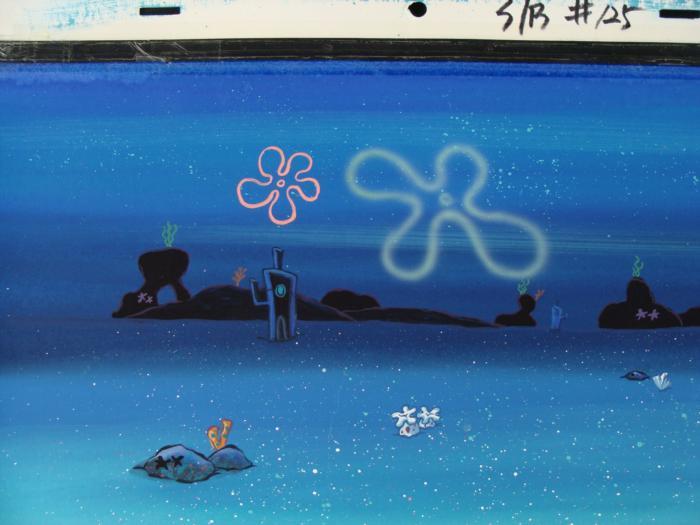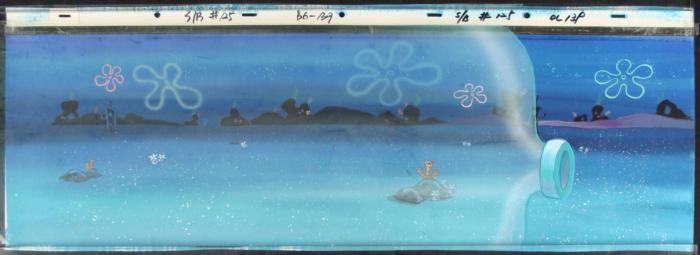 This is an original hand-painted background from the Nickelodeon television show SpongeBob Squarepants. The story takes place under the deep blue sea in Bikini Bottom, where SpongeBob resides. SpongeBob, who is a yellow, porous sponge, is your typical happy-go-lucky character, as he is always cheerful and enjoys making people laugh. Patrick Star, SpongeBob's neighbor who is a starfish, who boasts knowing nothing and is often getting himself into ridiculous situations. Between the homes of these two lies the home of the miserable Squidward, a squid, who is known for being grouchy and playing tricks on SpongeBob and Patrick. Both SpongeBob and Squidward work at the Krusty Krab, a fast food business run by the greedy money-loving Mr. Krabs, a crab, the arch rival of the evil, possibly misunderstood, Plankton. Another neighbor, Sandy Cheeks, an athletic squirrel who normally wears an astronaut's space suit, was introduced in "Tea at the Treedome." She spends most of her time inventing and experimenting. This background shows what appears an under the sea view from a bottle, with vibrant blues, and colorful rocks and coral.Original Production Background on paper, with peg holes; bottle painted on cel acetate overlaySizes of sheet: 31 x 11 inches.Very good condition; has been stored rolledOriginal Production Backgrounds are used in the making of the final version of animated productions. The background establishes the location and the overall good mood of the scene. Typically, a background layout artist creates a drawing to establish the content of the scene, placement of characters, perspective and camera angle. Based on this drawing, the background artist creates a preliminary painting to confirm all of the scenes details, then the final production background which is used in the filming of the scene. When these backgrounds are individually photographed behind the progression of production cels, and projected at a rapid succession, the images in the foreground appear to move, creating an animated scene. The background is ready to be matted and framed. It includes animator's notations, and a 2003 Viacom copyright stamp at the lower edge.