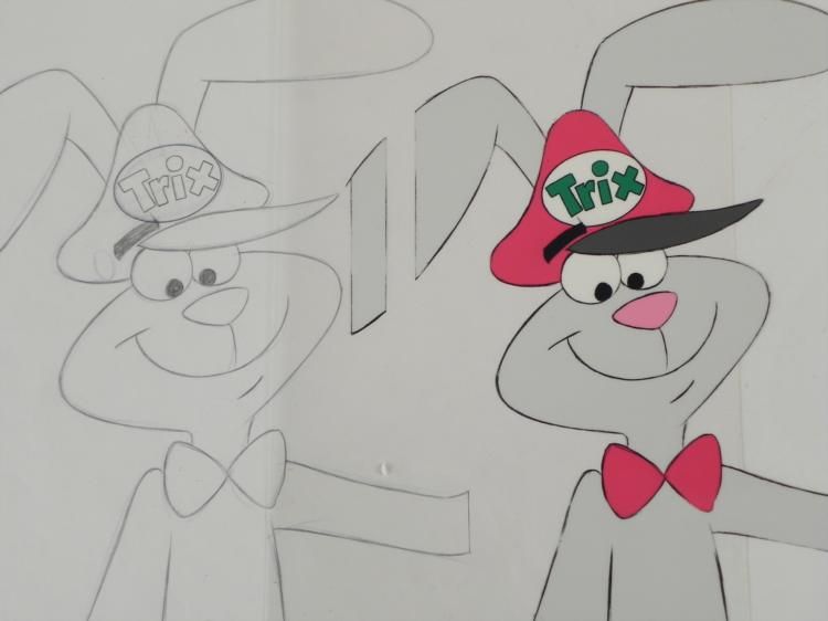 In this cel/drawing, the Trix rabbit has a big smile on his face. This original animation cel & drawing are from the production of the Trix cereal commercial. Original Animation Cel & DrawingMedium: Hand painted acetate celDetails: Animation notations and peg holes Original "rough" animation drawing, in non-photo blue and black pencil Size of cel: 10 1/2 x 12 1/2 inchesSize of drawing: 10 1/2 x 12 1/2 inches Condition: Very good This is an original hand-painted cel set-up used in the production of the "Trix Cereal Commercial." Each one-of-a-kind set-up represents a slight change in position of the characters. When individually photographed and projected in rapid succession, the images appear to move. To created production cels, the original animator's drawing is transferred onto an acetate cel (by hand-inking and/or photo copying). The cel is then hand-painted on the reverse side. Traditional animation is a multi-step process which includes various types of art techniques. Drawings are a key part of the process, in which the animator creates the design and movement of the characters. Drawings are then transferred onto acetate cels (by hand-inking and/or photo copying) to create a production cel, which is then hand painted on the back side, using paint colors chosen and approved by the creator of the series.