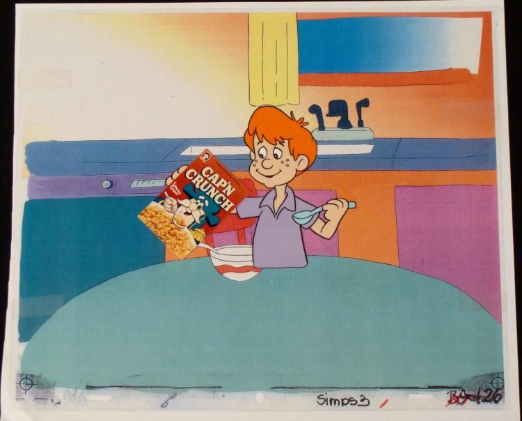 Cap'n Crunch always hits the spot. YUM! * * * Original Animation Cel & Printed Background * * Medium: Hand painted acetate celDetails: Animation notations and peg holes * * Size of cel: 10 1/2 x 12 1/2 inchesSize of background: 11 x 13 inches * * Condition: Very good * * * This is an original hand-painted cel set-up used in the production of the "Cap'n. Crunch Commercial." Each one-of-a-kind set-up represents a slight change in position of the characters. When individually photographed and projected in rapid succession, the images * appear to move. To created production cels, the original animator's drawing is transferred onto an acetate cel (by hand-inking and/or photo copying). The cel is then hand-painted on the reverse side. The background accompanying this cel is a reproduction printed * background. * * *