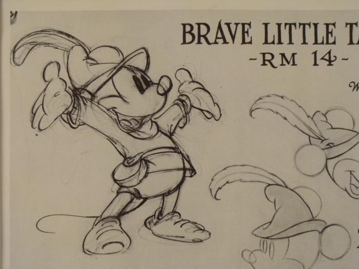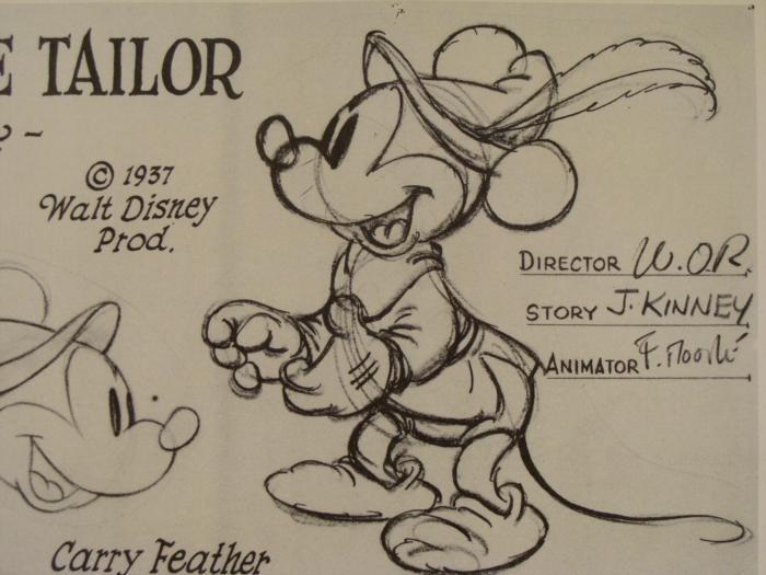 This is an original period production art photostat of a model sheet drawing from the 1937 Disney animated short film Brave Little Tailor. Model sheets were passed around to the various departments in the Disney production studios to maintain consistency among the different animators. This particular sheet depicts various poses of Mickey Mouse. It has detailed animator notations that let you see how the drawings were created. It also has the signed names of the Director, Story editor, and Animator, suggesting that this sheet went to the top people on the project. Medium: Photostat on paper Matting: Double matted in black and whiteImage area: 9 1/8 x 11 1/2 inches Framing: Brown tone wood frame Frame size: 17 1/2 x 19 7/8 inches Condition: Excellent, with minor tear-through at the center (note: model sheets were designed to be used, and they often got worn or discarded) Model sheets such as this were used in the creation of animation, and it provides a unique glimpse into the production process. Traditional animation is a multi-step process, of which drawings are a key part. The animator creates the design and movement of the characters from drawings, and these drawings are then transferred onto acetate cels to create a production cel.