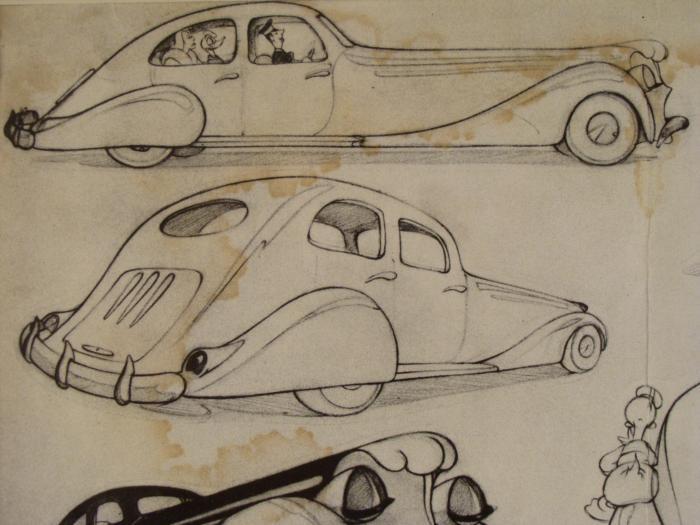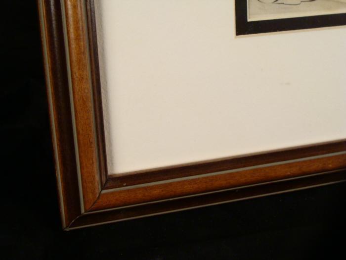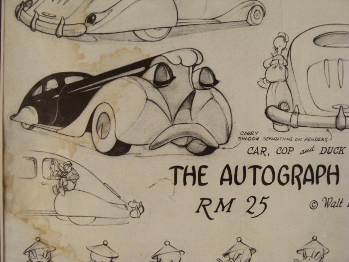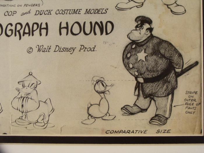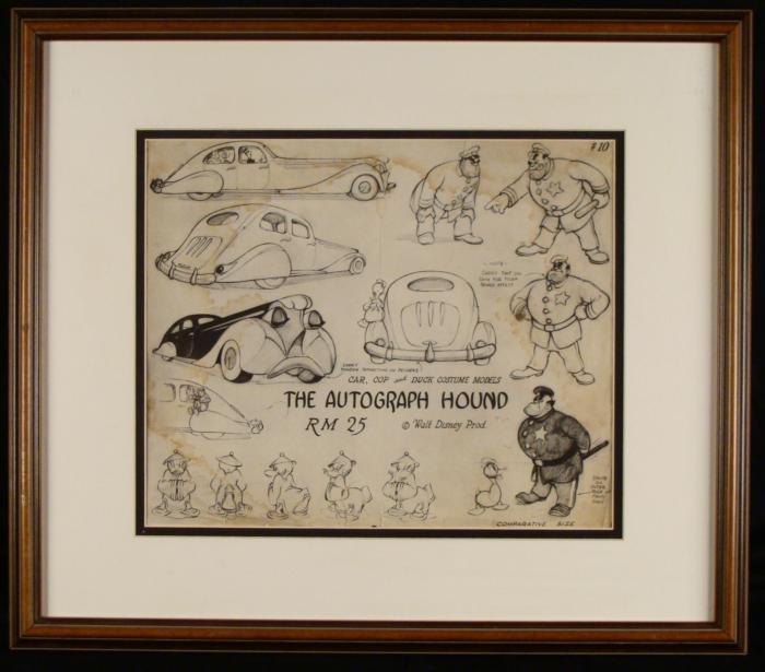 This is an original period production art photostat of a model sheet drawing from the 1939 Disney animated feature film The Autograph Hound. Model sheets were passed around to the various departments in the Disney production studios to maintain consistency among the different animators. This particular art is subtitled "Car, Cop and Duck Costume Models," and it features Donald Duck. The cop is a main character in the feature. The car images are fabulous, showing a sleek model of its day taking on a real personality. There are also some notations for the animators, and a comparison size visual with Donald Duck and the cop. Medium: Photostat on paper Matting: Double matted in black and whiteImage area: 11 3/4 x 14 1/4 inches Framing: Brown tone wood frame Frame size: 19 3/4 x 22 3/4 inches Condition: Good, with some wrinkling, crease marks, and water staining (note: model sheets were designed to be used, and they often got worn or discarded) Model sheets such as this were used in the creation of animation, and it provides a unique glimpse into the production process. Traditional animation is a multi-step process, of which drawings are a key part. The animator creates the design and movement of the characters from drawings, and these drawings are then transferred onto acetate cels to create a production cel.