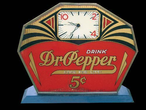 Dr. Pepper Art Deco Style Clock, Extremely Rare. All original. Not a reproduction. Some staining on the inside of glass and slight paint lifting at bottom otherwise very good condition. 19 X 22 inches.