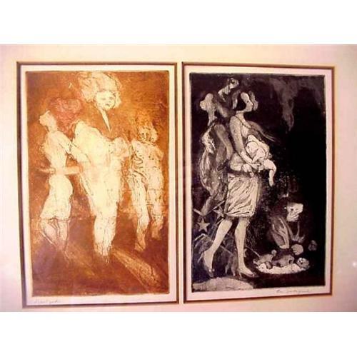 This set of original engravings is by well-known California Artist and Educator Ben Sakoguchi. Since the 1960s, Ben Sakoguchi has produced a prolific body of work, including the small, beautifully rendered paintings known as the Orange Crate Label Series, which blend humor, sarcasm, and social commentary in their recontextualized images. Sakoguchi is represented in many public and private collections, including the Baseball Reliquary, the Museum of Modern Art (New York), and the Library of Congress. His widely acclaimed series POSTCARDS FROM CAMP capture the plight of Japanese Americans interned at camps during WWII.<p>Both engravings measure 7" x 11" (image area). They are framed under glass in narrow antique gold wood frames measuring 21 1/2" x 18". This fine artwork is a Diptych. Artwork is crisp and fresh in a custom-made recessed mat under glass. Wood frame is servicable and appears original to the piece. The artwork was professionally framed as seen by the label on the verso.<p>The first engraving features three female figures, almost apparitions, in various stages of life. The second features a young Japanese woman holding a child. In the background is an apparition of a pregnant woman, and on the right sits an aged man laughing at a broken, disjointed doll.<p>This fine artwork is labeled and signed in pencil in the margin, as seen above. <p>Diptych - A picture or bas-relief made of two panels hinged together, often an altarpiece. Also, any picture consisting ...