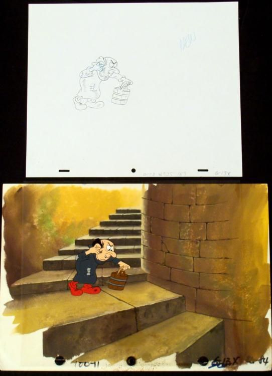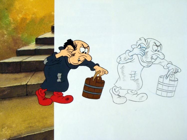 Gargamel is an evil man * * * Original Animation Cel & Production Background & Drawing * * Medium: Hand painted acetate celDetails: Animation notations and peg holes * * Size of background: 10 1/2 x 14 inches * * Size of drawing: 10 1/2 x 12 1/2 inches * * Size of cel: 10 1/2 x 12 1/2 inchesCondition: Very good * This is an original hand-painted cel set-up of the production of an episode of "The Smurfs". Each one-of-a-kind set-up represents a slight change in position of the characters. When individually photographed and projected in rapid succession, the images appear * to move. To created production cels, the original animator's drawing is transferred onto an acetate cel (by hand-inking and/or photo copying). The cel is then hand-painted on the reverse side. The background accompanying this cel is an original hand-painted * background. * * * * Traditional animation is a multi-step process which includes various types of art techniques. Drawings are a key part of the process, in which the animator creates the design and movement of the characters. Drawings are then transferred onto acetate cels * (by hand-inking and/or photo copying) to create a production cel, which is then hand painted on the back side, using paint colors chosen and approved by the creator of the series. * * * * * * * *