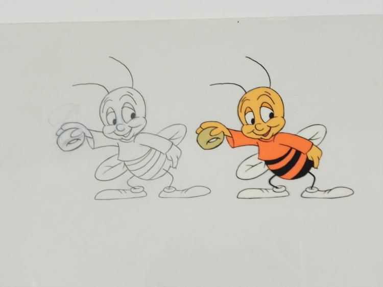 Buzz is holding one of his famous Honey Nut Cheerios * * * Original Animation Cel & DrawingMedium: Hand painted acetate celDetails: Animation notations and peg holes * * Original "rough" animation drawing, in non-photo blue and black pencil * * Size of cel: 10 1/2 x 12 1/2 inchesSize of drawing: 10 1/2 x 12 1/2 inches * * Condition: Very good * This is an original hand-painted cel set-up used in the production of * the "Cheerios commercial." Each one-of-a-kind set-up represents a slight * change in position of the characters. When individually photographed * and projected in rapid succession, the images * appear to move. To created production cels, the original animator's * drawing is transferred onto an acetate cel (by hand-inking and/or photo * copying). The cel is then hand-painted on the reverse side. * * * * Traditional animation is a multi-step process which includes various * types of art techniques. Drawings are a key part of the process, in * which the animator creates the design and movement of the characters. * Drawings are then transferred onto acetate cels * (by * hand-inking and/or photo copying) to create a production cel, which is * then hand painted on the back side, using paint colors chosen and * approved by the creator of the series.