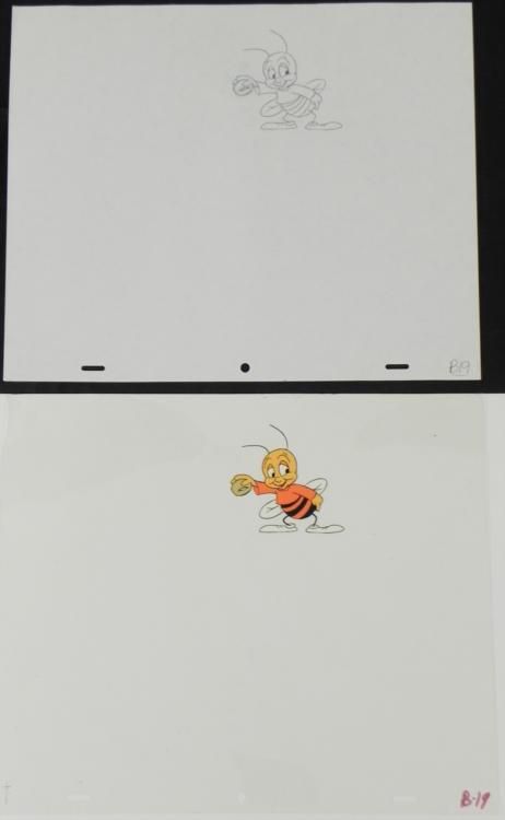 Buzz is holding one of his famous Honey Nut Cheerios Original Animation Cel & DrawingMedium: Hand painted acetate celDetails: Animation notations and peg holes Original "rough" animation drawing, in non-photo blue and black pencil Size of cel: 10 1/2 x 12 1/2 inchesSize of drawing: 10 1/2 x 12 1/2 inches Condition: Very good This is an original hand-painted cel set-up used in the production of  the "Cheerios commercial." Each one-of-a-kind set-up represents a slight  change in position of the characters. When individually photographed  and projected in rapid succession, the images  appear to move. To created production cels, the original animator's  drawing is transferred onto an acetate cel (by hand-inking and/or photo  copying). The cel is then hand-painted on the reverse side.  Traditional animation is a multi-step process which includes various  types of art techniques. Drawings are a key part of the process, in  which the animator creates the design and movement of the characters.  Drawings are then transferred onto acetate cels (by  hand-inking and/or photo copying) to create a production cel, which is  then hand painted on the back side, using paint colors chosen and  approved by the creator of the series.