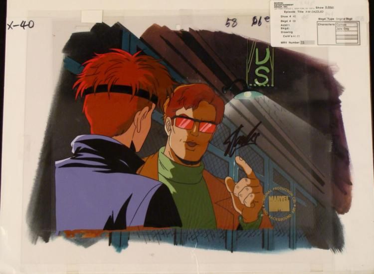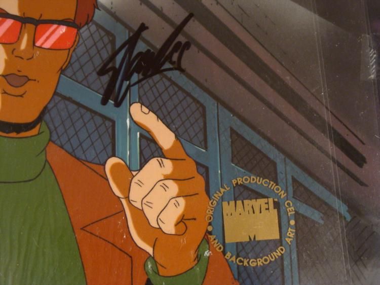 This is an original signed production cel and background from the hit series X-Men. Stan Lee signature is located on the right of cel in black sharpie. * * Under a cloud of increasing anti-mutant sentiment, Professor Xavier creates a haven at his Westchester mansion to train young mutants to use their powers for the benefit of humanity, and to prove mutants can be heroes. Xavier recruited Cyclops, Iceman, Angel, * Beast and Jean Grey calling them "X-Men" because they possessed the "x-gene", an ability normal humans lacked. Early issues introduced the team's arch enemy, Magneto and his Brotherhood of Evil Mutants, who would later battle the X-Men for years. * * Jean, I'm here to protect you! * * * * * Original Animated Cel & Production BackgroundMedium: Hand painted acetate celDetails: Animation notations and peg holes * * Overall Size of the Cel: 10 1/2" x 12 1/2" * Overall Size of the background: 10 1/2" x 15" * Excellent Condition * * This is an original hand-painted cel set-up used in the production of an episode of X-Men titled "Dazzled." Each one-of-a-kind set-up represents a slight change in position of the characters. When individually photographed and projected in rapid succession, * the images appear to move. * * To create production cels, the original animator's drawing is transferred onto an acetate cel (by hand-inking and/or photo copying). The cel is then hand-painted on the reverse side. The background accompanying this set-up is an original production background. * * * The cel and original background is ready to be matted and framed. The animators notations are located at the bottom of the cel and background. A Certificate of Authenticity from Marvel is on * the back of background. The Marvel Seal is located at the bottom right of the cel. The cel and background are in a protective sleeve. An information card about the episode is located at the top right of the protective sleeve. The cel has multiple layers. * * *