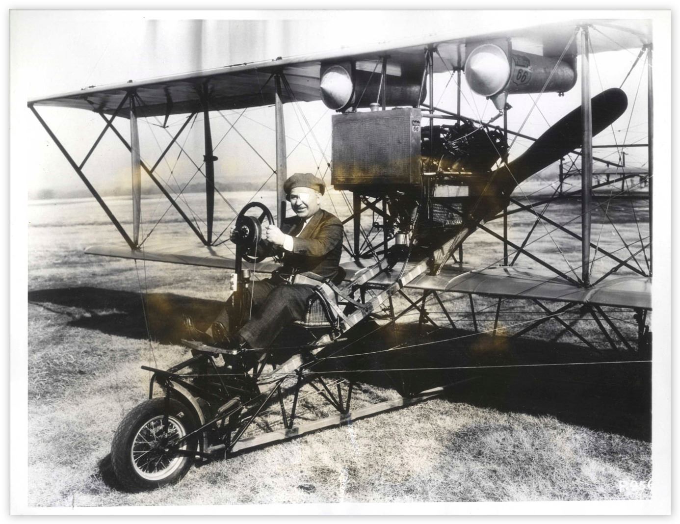 Press photograph of around-the-world aviator Wiley Post at the controls of a 1912 model ''Pusher'' plane. Photo is date stamped 5 December 1934 on verso, the year before Post died in a plane crash with his friend Will Rogers. Measures 9'' x 7'', semi-gloss photo has some discoloration. Very good condition.