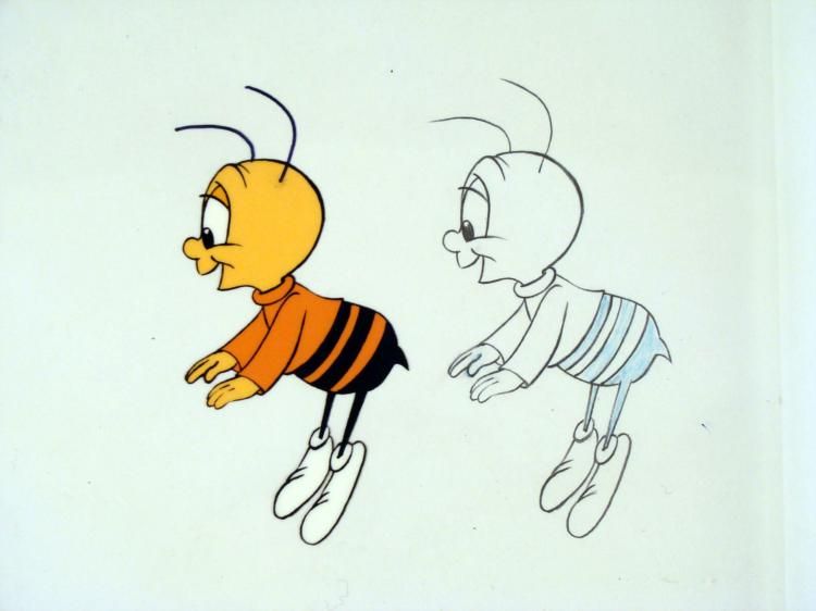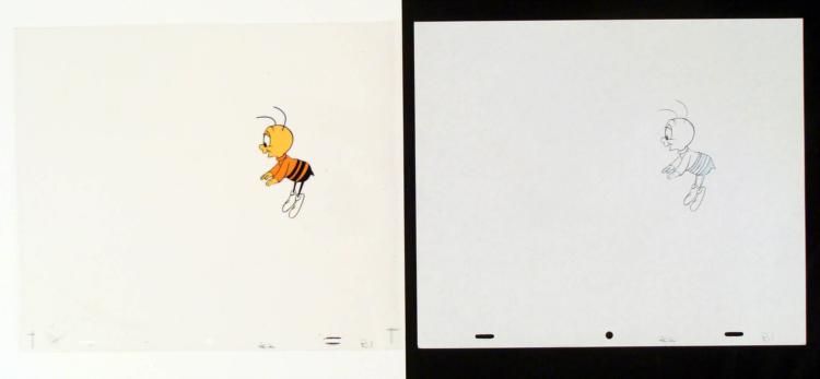 In this cel/drawing, Buzz looks intrigued to something. This original animation cel & drawing are from the production of the Cheerios cereal commercial. * * * Original Animation Cel & DrawingMedium: Hand painted acetate celDetails: Animation notations and peg holes * * Original "rough" animation drawing, in non-photo blue and black pencil * * Size of cel: 10 1/2 x 12 1/2 inchesSize of drawing: 10 1/2 x 12 1/2 inches * * Condition: Very good * This is an original hand-painted cel set-up used in the production of the "Cheerios commercial." Each one-of-a-kind set-up represents a slight change in position of the characters. When individually photographed and projected in rapid succession, the images * appear to move. To created production cels, the original animator's drawing is transferred onto an acetate cel (by hand-inking and/or photo copying). The cel is then hand-painted on the reverse side. * * * * Traditional animation is a multi-step process which includes various types of art techniques. Drawings are a key part of the process, in which the animator creates the design and movement of the characters. Drawings are then transferred onto acetate cels.