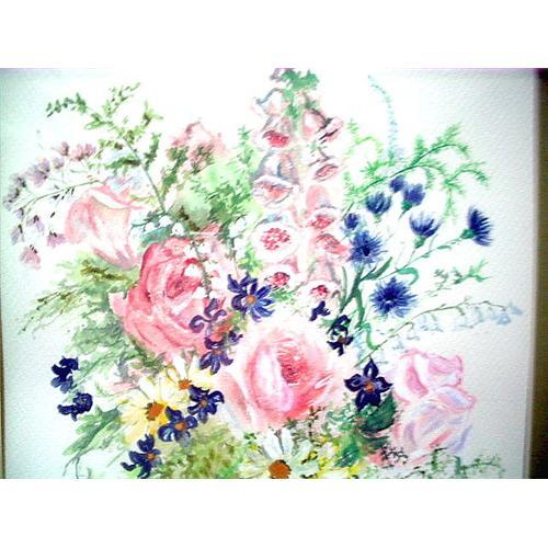 Depicts a beautiful array of countryside wildflowers, including lily of the Valley, Foxgloves, cornflowers, daisies, ferns, ivy and lovely pink open roses. Colors are magnificent, pastels of soft pinks and greens, with dramatic indigo blues for the cornflowers and narcissus, blended nicely with the dramatic whites of the lilly of the valley and daisies. A beautifully executed rendition of wildflowers.