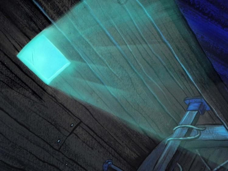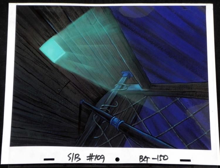 This original hand-painted background with cel overlay is from the Nickelodeon TV show SpongeBob Squarepants. The story takes place under the deep blue sea in Bikini Bottom, where SpongeBob resides. SpongeBob, who is a yellow, porous sponge, is your typical happy-go-lucky character, as he is always cheerful and enjoys making people laugh. Patrick Star, SpongeBob's neighbor who is a starfish, boasts knowing nothing and is often getting himself into ridiculous situations. Between the homes of these two lies the home of the miserable Squidward, a squid, who is known for being grouchy and playing tricks on SpongeBob and Patrick. Both SpongeBob and Squidward work at the Krusty Krab, a fast food business run by the greedy money-loving Mr. Krabs, a crab, the arch rival of the evil, possibly misunderstood, Plankton. Another neighbor, Sandy Cheeks, an athletic squirrel who normally wears an astronaut's space suit, was introduced in "Tea at the Treedome." She spends most of her time inventing and experimenting. A hatch in the ship brings light streaming into the dark cabin. * * Overall Size of Background: 10" x 13" Overall size of cel: 10" x 13"Very good conditionOriginal Production Backgrounds are used in the making of the final version of animated productions. The background establishes the location and the overall good mood of the scene. Typically, a background layout artist creates a drawing to establish the content of the scene, placement of characters, perspective and camera angle. Based on this drawing, the background artist creates a preliminary painting to confirm all of the scenes details, then the final production background which is used in the filming of the scene. When these backgrounds are individually photographed behind the progression of production cels, and projected at a rapid succession, the images in the foreground appear to move, creating an animated scene. * This is a 2 layer background made for a lightning effect. One layer has the background scenery, and another has a cel overlay with light.The bottom of the sheet has peg holes, and the animator's notations. *