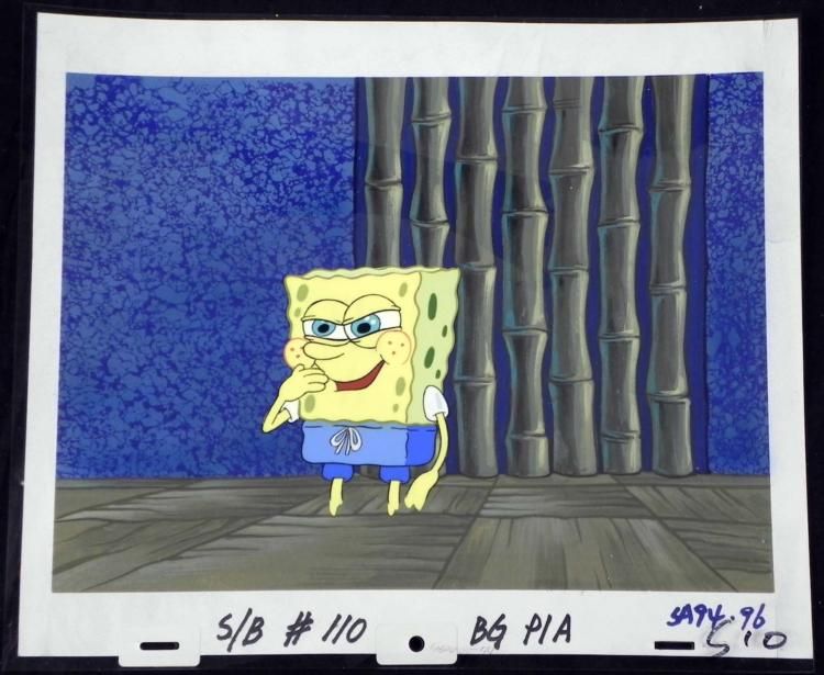 This original hand-painted cel and background are from the Nickelodeon TV show SpongeBob Squarepants. The story takes place under the deep blue sea in Bikini Bottom, where SpongeBob resides. SpongeBob, who is a yellow, porous sponge, is your typical happy-go-lucky character, as he is always cheerful and enjoys making people laugh. Patrick Star, SpongeBob's neighbor who is a starfish, boasts knowing nothing and is often getting himself into ridiculous situations. Between the homes of these two lies the home of the miserable Squidward, a squid, who is known for being grouchy and playing tricks on SpongeBob and Patrick. Both SpongeBob and Squidward work at the Krusty Krab, a fast food business run by the greedy money-loving Mr. Krabs, a crab, the arch rival of the evil, possibly misunderstood, Plankton. Another neighbor, Sandy Cheeks, an athletic squirrel who normally wears an astronaut's space suit, was introduced in "Tea at the Treedome." She spends most of her time inventing and experimenting. * SpongeBob looks like quite the devious sponge here! * * Overall Size of Background: 10 1/2" x 14" Overall size of cel: 10 1/2" x 12 1/2"Very good conditionOriginal Production Backgrounds are used in the making of the final version of animated productions. The background establishes the location and the overall good mood of the scene. Typically, a background layout artist creates a drawing to establish the content of the scene, placement of characters, perspective and camera angle. Based on this drawing, the background artist creates a preliminary painting to confirm all of the scenes details, then the final production background which is used in the filming of the scene. When these backgrounds are individually photographed behind the progression of production cels, and projected at a rapid succession, the images in the foreground appear to move, creating an animated scene. * This cel was placed with this background because it appears to go well with it. The bottom of the sheets have peg holes, and animator's notations. *