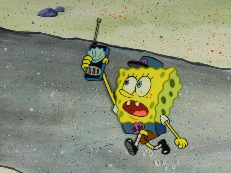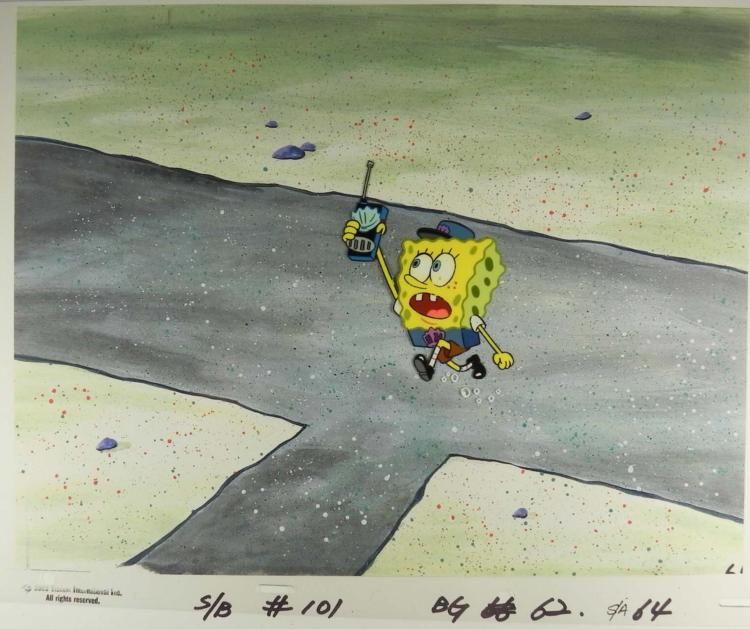 This original hand-painted cel with reproduction background is from the Nickelodeon TV show SpongeBob Squarepants. The story takes place under the deep blue sea in Bikini Bottom, where SpongeBob resides. SpongeBob, who is a yellow, porous sponge, is your typical happy-go-lucky character, as he is always cheerful and enjoys making people laugh. Patrick Star, SpongeBob's neighbor who is a starfish, boasts knowing nothing and is often getting himself into ridiculous situations. Between the homes of these two lies the home of the miserable Squidward, a squid, who is known for being grouchy and playing tricks on SpongeBob and Patrick. Both SpongeBob and Squidward work at the Krusty Krab, a fast food business run by the greedy money-loving Mr. Krabs, a crab, the arch rival of the evil, possibly misunderstood, Plankton. Another neighbor, Sandy Cheeks, an athletic squirrel who normally wears an astronaut's space suit, was introduced in "Tea at the Treedome." She spends most of her time inventing and experimenting. It's an urgent moment for SpongeBob as the Hall Monitor, as he dashes down the road. * * Overall Size of Background: 11" x 17" (image size is smaller)Overall size of cel: 10 1/2" x 12 1/2"Very good conditionOriginal Production Backgrounds are used in the making of the final version of animated productions. The background establishes the location and the overall good mood of the scene. Typically, a background layout artist creates a drawing to establish the content of the scene, placement of characters, perspective and camera angle. Based on this drawing, the background artist creates a preliminary painting to confirm all of the scenes details, then the final production background which is used in the filming of the scene. When these backgrounds are individually photographed behind the progression of production cels, and projected at a rapid succession, the images in the foreground appear to move, creating an animated scene. * This cel was placed with this background because it appears to go well with it. The bottom of the sheet has peg holes, and the animator's notations. *