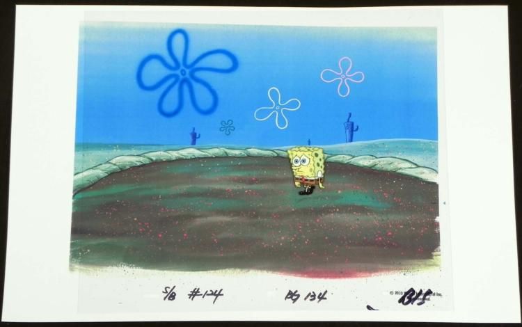 This original hand-painted cel with reproduction background is from the Nickelodeon TV show SpongeBob Squarepants. The story takes place under the deep blue sea in Bikini Bottom, where SpongeBob resides. SpongeBob, who is a yellow, porous sponge, is your typical happy-go-lucky character, as he is always cheerful and enjoys making people laugh. Patrick Star, SpongeBob's neighbor who is a starfish, boasts knowing nothing and is often getting himself into ridiculous situations. Between the homes of these two lies the home of the miserable Squidward, a squid, who is known for being grouchy and playing tricks on SpongeBob and Patrick. Both SpongeBob and Squidward work at the Krusty Krab, a fast food business run by the greedy money-loving Mr. Krabs, a crab, the arch rival of the evil, possibly misunderstood, Plankton. Another neighbor, Sandy Cheeks, an athletic squirrel who normally wears an astronaut's space suit, was introduced in "Tea at the Treedome." She spends most of her time inventing and experimenting. What happened SpongeBob--isn't there suppposed to be a house here? * * Overall Size of Background: 11" x 17" Overall size of cel: 12 1/2" x 10 1/2"Very good conditionOriginal Production Backgrounds are used in the making of the final version of animated productions. The background establishes the location and the overall good mood of the scene. Typically, a background layout artist creates a drawing to establish the content of the scene, placement of characters, perspective and camera angle. Based on this drawing, the background artist creates a preliminary painting to confirm all of the scenes details, then the final production background which is used in the filming of the scene. When these backgrounds are individually photographed behind the progression of production cels, and projected at a rapid succession, the images in the foreground appear to move, creating an animated scene. * This is a 2 layer background made for a lightning effect. One layer has the background scenery, and another has a cel overlay with light.The bottom of the sheet has peg holes, and the animator's notations. *