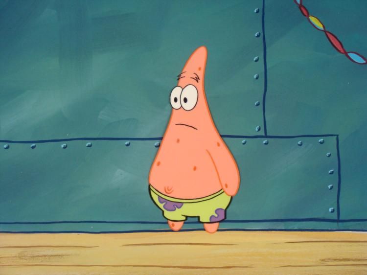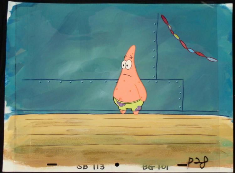 This original hand-painted cel and background are from the Nickelodeon TV show SpongeBob Squarepants. The story takes place under the deep blue sea in Bikini Bottom, where SpongeBob resides. SpongeBob, who is a yellow, porous sponge, is your typical happy-go-lucky character, as he is always cheerful and enjoys making people laugh. Patrick Star, SpongeBob's neighbor who is a starfish, boasts knowing nothing and is often getting himself into ridiculous situations. Between the homes of these two lies the home of the miserable Squidward, a squid, who is known for being grouchy and playing tricks on SpongeBob and Patrick. Both SpongeBob and Squidward work at the Krusty Krab, a fast food business run by the greedy money-loving Mr. Krabs, a crab, the arch rival of the evil, possibly misunderstood, Plankton. Another neighbor, Sandy Cheeks, an athletic squirrel who normally wears an astronaut's space suit, was introduced in "Tea at the Treedome." She spends most of her time inventing and experimenting. * Patrick has realized he forgot to get dressed up for the party. * * Overall Size of Background: 10 1/2" x 14" Overall size of cel: 10 1/2" x 12 1/2"Very good conditionOriginal Production Backgrounds are used in the making of the final version of animated productions. The background establishes the location and the overall good mood of the scene. Typically, a background layout artist creates a drawing to establish the content of the scene, placement of characters, perspective and camera angle. Based on this drawing, the background artist creates a preliminary painting to confirm all of the scenes details, then the final production background which is used in the filming of the scene. When these backgrounds are individually photographed behind the progression of production cels, and projected at a rapid succession, the images in the foreground appear to move, creating an animated scene. * This cel was placed with this background because it appears to go well with it. The bottom of the sheets have peg holes, and the animator's notations. *