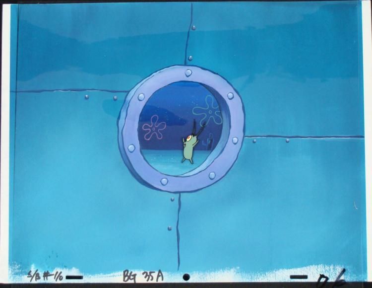 This original hand-painted cel and background is from the Nickelodeon TV show SpongeBob Squarepants. The story takes place under the deep blue sea in Bikini Bottom, where SpongeBob resides. SpongeBob, who is a yellow, porous sponge, is your typical happy-go-lucky character, as he is always cheerful and enjoys making people laugh. Patrick Star, SpongeBob's neighbor who is a starfish, boasts knowing nothing and is often getting himself into ridiculous situations. Betweenthe homes of these two lies the home of the miserable Squidward, a squid, who is known for being grouchy and playing tricks on SpongeBob and Patrick. Both SpongeBob and Squidward work at the Krusty Krab, a fast food business run by the greedy money-loving Mr. Krabs, a crab, the arch rival of the evil, possibly misunderstood, Plankton. Another neighbor, Sandy Cheeks, an athletic squirrel who normally wears an astronaut's space suit, was introduced in "Tea at the Treedome." She spends most of her time inventing and experimenting. Plankton looks like he's ready to jump out the window. * * Overall Size of Background: 10 1/2" x 14" Overall size of cel: 10 1/2" x 12 1/2"Very good conditionOriginal Production Backgrounds are used in the making of the final version of animated productions. The background establishes the location and the overall good mood of the scene. Typically, a background layout artist creates a drawing to establish the content of the scene, placement of characters, perspective and camera angle. Based on this drawing, the background artist creates a preliminary painting to confirm all of the scenes details, then the final production background which is used in the filming of the scene. When these backgrounds are individually photographed behind the progression of production cels, and projected at a rapid succession, the images in the foreground appear to move, creating an animated scene. * This cel was placed with this background because it appears to go well with it. The bottom of the sheet has peg holes, and the animator's notations. *