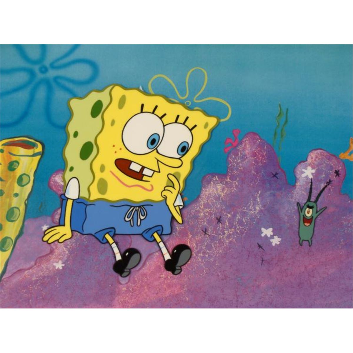 This original hand-painted cel and reproduction background is from the Nickelodeon TV show SpongeBob Squarepants. The story takes place under the deep blue sea in Bikini Bottom, where SpongeBob resides. SpongeBob, who is a yellow, porous sponge, is your typical happy-go-lucky character, as he is always cheerful and enjoys making people laugh. Patrick Star, SpongeBob's neighbor who is a starfish, boasts knowing nothing and is often getting himself into ridiculous situations. Between the homes of these two lies the home of the miserable Squidward, a squid, who is known for being grouchy and playing tricks on SpongeBob and Patrick. Both SpongeBob and Squidward work at the Krusty Krab, a fast food business run by the greedy money-loving Mr. Krabs, a crab, the arch rival of the evil, possibly misunderstood, Plankton. Another neighbor, Sandy Cheeks, an athletic squirrel who normally wears an astronaut's space suit, was introduced in "Tea at the Treedome." She spends most of her time inventing and experimenting. Squidward tells SpongeBob of his diabolical plan! * * Overall Size of Background: 11" x 17" Overall size of cel: 10 1/2" x 12 1/2"Very good conditionOriginal Production Backgrounds are used in the making of the final version of animated productions. The background establishes the location and the overall good mood of the scene. Typically, a background layout artist creates a drawing to establish the content of the scene, placement of characters, perspective and camera angle. Based on this drawing, the background artist creates a preliminary painting to confirm all of the scenes details, then the final production background which is used in the filming of the scene. When these backgrounds are individually photographed behind the progression of production cels, and projected at a rapid succession, the images in the foreground appear to move, creating an animated scene. * This cel was placed with this background because it appears to go well with it. The bottom of the sheet has peg holes, and the animator's notations. *
