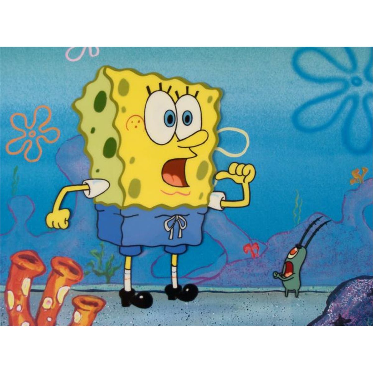 This original hand-painted cel with reproduction background is from the Nickelodeon TV show SpongeBob Squarepants. The story takes place under the deep blue sea in Bikini Bottom, where SpongeBob resides. SpongeBob, who is a yellow, porous sponge, is your typical happy-go-lucky character, as he is always cheerful and enjoys making people laugh. Patrick Star, SpongeBob's neighbor who is a starfish, boasts knowing nothing and is often getting himself into ridiculous situations. Between the homes of these two lies the home of the miserable Squidward, a squid, who is known for being grouchy and playing tricks on SpongeBob and Patrick. Both SpongeBob and Squidward work at the Krusty Krab, a fast food business run by the greedy money-loving Mr. Krabs, a crab, the arch rival of the evil, possibly misunderstood, Plankton. Another neighbor, Sandy Cheeks, an athletic squirrel who normally wears an astronaut's space suit, was introduced in "Tea at the Treedome." She spends most of her time inventing and experimenting. Plankton encourages SpongeBob as he falls under his evil spell! * * Overall Size of Background: 11" x 17" Overall size of cel: 10 1/2" x 12 1/2"Very good conditionOriginal Production Backgrounds are used in the making of the final version of animated productions. The background establishes the location and the overall good mood of the scene. Typically, a background layout artist creates a drawing to establish the content of the scene, placement of characters, perspective and camera angle. Based on this drawing, the background artist creates a preliminary painting to confirm all of the scenes details, then the final production background which is used in the filming of the scene. When these backgrounds are individually photographed behind the progression of production cels, and projected at a rapid succession, the images in the foreground appear to move, creating an animated scene. * This cel was placed with this background because it appears to go well with it. The bottom of the sheet has peg holes, and the animator's notations. *