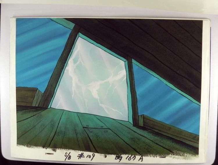 This original hand-painted cel with reproduction background is from the Nickelodeon TV show SpongeBob Squarepants. The story takes place under the deep blue sea in Bikini Bottom, where SpongeBob resides. SpongeBob, who is a yellow, porous sponge, is your typical happy-go-lucky character, as he is always cheerful and enjoys making people laugh. Patrick Star, SpongeBob's neighbor who is a starfish, boasts knowing nothing and is often getting himself into ridiculous situations. Between the homes of these two lies the home of the miserable Squidward, a squid, who is known for being grouchy and playing tricks on SpongeBob and Patrick. Both SpongeBob and Squidward work at the Krusty Krab, a fast food business run by the greedy money-loving Mr. Krabs, a crab, the arch rival of the evil, possibly misunderstood, Plankton. Another neighbor, Sandy Cheeks, an athletic squirrel who normally wears an astronaut's space suit, was introduced in "Tea at the Treedome." She spends most of her time inventing and experimenting. It was a dark and stormy night at the Krusty Krab. * * Overall Size of Background: 11 1/2" x 14" Overall size of cel: 11 1/2" x 14"Very good conditionOriginal Production Backgrounds are used in the making of the final version of animated productions. The background establishes the location and the overall good mood of the scene. Typically, a background layout artist creates a drawing to establish the content of the scene, placement of characters, perspective and camera angle. Based on this drawing, the background artist creates a preliminary painting to confirm all of the scenes details, then the final production background which is used in the filming of the scene. When these backgrounds are individually photographed behind the progression of production cels, and projected at a rapid succession, the images in the foreground appear to move, creating an animated scene. * This is a multi layer background made for a lightning effect. One layer has the interior and cut-out doorway. Another layer has a dark blue background, with with cel overlay featuring a window glare. The other background is lightning streaks. It can be displayed two different ways.The bottom of the sheet has peg holes, and the animator's notations. *