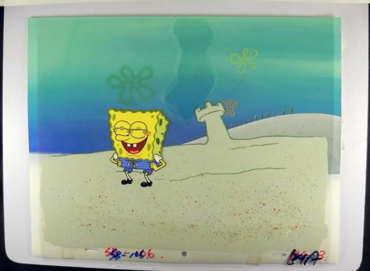 This original hand-painted cel with reproduction background is from the Nickelodeon TV show SpongeBob Squarepants. The story takes place under the deep blue sea in Bikini Bottom, where SpongeBob resides. SpongeBob, who is a yellow, porous sponge, is your typical happy-go-lucky character, as he is always cheerful and enjoys making people laugh. Patrick Star, SpongeBob's neighbor who is a starfish, boasts knowing nothing and is often getting himself into ridiculous situations. Between the homes of these two lies the home of the miserable Squidward, a squid, who is known for being grouchy and playing tricks on SpongeBob and Patrick. Both SpongeBob and Squidward work at the Krusty Krab, a fast food business run by the greedy money-loving Mr. Krabs, a crab, the arch rival of the evil, possibly misunderstood, Plankton. Another neighbor, Sandy Cheeks, an athletic squirrel who normally wears an astronaut's space suit, was introduced in "Tea at the Treedome." She spends most of her time inventing and experimenting. Somebody has built a sand castle, and SpongeBob thinks something is awfully funny! * * Overall Size of Background: 11" x 14 1/2" Overall size of cel: 10 1/2" x 12 1/2"Very good conditionOriginal Production Backgrounds are used in the making of the final version of animated productions. The background establishes the location and the overall good mood of the scene. Typically, a background layout artist creates a drawing to establish the content of the scene, placement of characters, perspective and camera angle. Based on this drawing, the background artist creates a preliminary painting to confirm all of the scenes details, then the final production background which is used in the filming of the scene. When these backgrounds are individually photographed behind the progression of production cels, and projected at a rapid succession, the images in the foreground appear to move, creating an animated scene. * The bottom of the sheet has peg holes, and the animator's notations. *