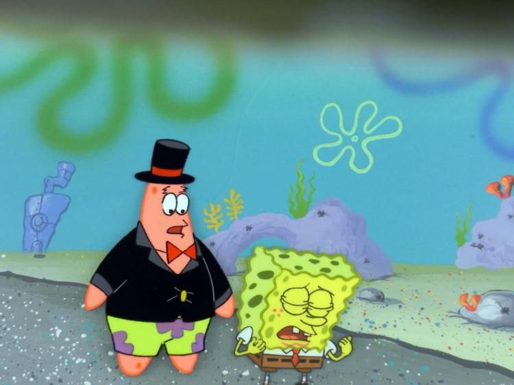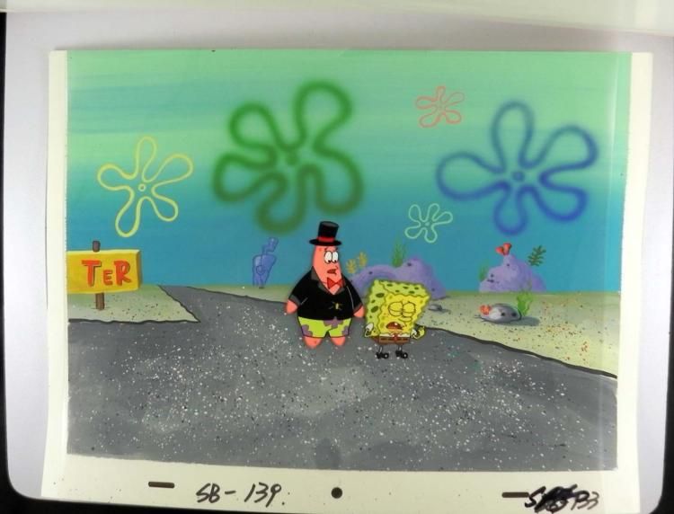 This original hand-painted cel with reproduction background is from the Nickelodeon TV show SpongeBob Squarepants. The story takes place under the deep blue sea in Bikini Bottom, where SpongeBob resides. SpongeBob, who is a yellow, porous sponge, is your typical happy-go-lucky character, as he is always cheerful and enjoys making people laugh. Patrick Star, SpongeBob's neighbor who is a starfish, boasts knowing nothing and is often getting himself into ridiculous situations. Between the homes of these two lies the home of the miserable Squidward, a squid, who is known for being grouchy and playing tricks on SpongeBob and Patrick. Both SpongeBob and Squidward work at the Krusty Krab, a fast food business run by the greedy money-loving Mr. Krabs, a crab, the arch rival of the evil, possibly misunderstood, Plankton. Another neighbor, Sandy Cheeks, an athletic squirrel who normally wears an astronaut's space suit, was introduced in "Tea at the Treedome." She spends most of her time inventing and experimenting. SpongeBob and Patrick are on their way to a party, but SpongeBob is getting allergies. * * Overall Size of Background: 11" x 14 1/2" Overall size of cel: 10 1/2" x 12 1/2"Very good conditionOriginal Production Backgrounds are used in the making of the final version of animated productions. The background establishes the location and the overall good mood of the scene. Typically, a background layout artist creates a drawing to establish the content of the scene, placement of characters, perspective and camera angle. Based on this drawing, the background artist creates a preliminary painting to confirm all of the scenes details, then the final production background which is used in the filming of the scene. When these backgrounds are individually photographed behind the progression of production cels, and projected at a rapid succession, the images in the foreground appear to move, creating an animated scene. * This cel was placed with this background because it appears to go well with it.The bottom of the sheet has peg holes, and the animator's notations. *
