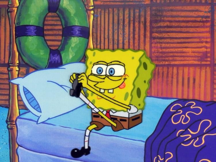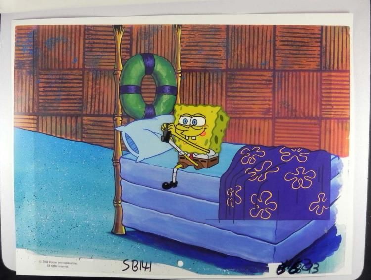 This original hand-painted cel with reproduction background is from the Nickelodeon TV show SpongeBob Squarepants. The story takes place under the deep blue sea in Bikini Bottom, where SpongeBob resides. SpongeBob, who is a yellow, porous sponge, is your typical happy-go-lucky character, as he is always cheerful and enjoys making people laugh. Patrick Star, SpongeBob's neighbor who is a starfish, boasts knowing nothing and is often getting himself into ridiculous situations. Between the homes of these two lies the home of the miserable Squidward, a squid, who is known for being grouchy and playing tricks on SpongeBob and Patrick. Both SpongeBob and Squidward work at the Krusty Krab, a fast food business run by the greedy money-loving Mr. Krabs, a crab, the arch rival of the evil, possibly misunderstood, Plankton. Another neighbor, Sandy Cheeks, an athletic squirrel who normally wears an astronaut's space suit, was introduced in "Tea at the Treedome." She spends most of her time inventing and experimenting. SpongeBob is on his bed putting on a shoe--all dressed and ready for the day! * * Overall Size of Background: 11" x 14 1/2" Overall size of cel: 10 1/2" x 12 1/2"Very good conditionOriginal Production Backgrounds are used in the making of the final version of animated productions. The background establishes the location and the overall good mood of the scene. Typically, a background layout artist creates a drawing to establish the content of the scene, placement of characters, perspective and camera angle. Based on this drawing, the background artist creates a preliminary painting to confirm all of the scenes details, then the final production background which is used in the filming of the scene. When these backgrounds are individually photographed behind the progression of production cels, and projected at a rapid succession, the images in the foreground appear to move, creating an animated scene. * The bottom of the sheet has peg holes, and the animator's notations. *
