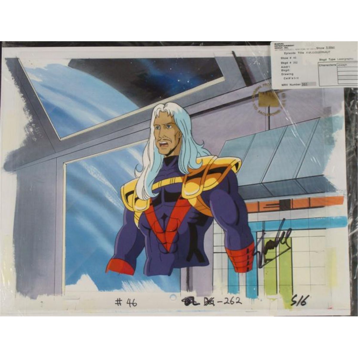 This is an original signed production cel and lasergraphic background, plus a matching drawing, from the hit series X-Men. Stan Lee signature is located on the bottom right of cel in black sharpie. * Under a cloud of increasing anti-mutant sentiment, Professor Xavier creates a haven at his Westchester mansion to train young mutants to use their powers for the benefit of humanity, and to prove mutants can be heroes. Xavier recruited Cyclops, Iceman, Angel, Beast and Jean Grey calling them "X-Men" because they possessed the "x-gene", an ability normal humans lacked. Early issues introduced the team's arch enemy, Magneto and his Brotherhood of Evil Mutants, who would later battle the X-Men for years. * May I ask, what the hell is going on?? * * Original Animated Cel Overall Size of the Cel: 10 1/2" x 12 1/2" Overall Size of the background: 10 1/4" x 14 1/4" Excellent Condition This is an original hand-painted cel set-up used in the production of an episode of X-Men titled "Juggernaut." Each one-of-a-kind set-up represents a slight change in position of the characters. When individually photographed and projected in rapid succession, the images appear to move. * To create production cels, the original animator's drawing is transferred onto an acetate cel (by hand-inking and/or photo copying). The cel is then hand-painted on the reverse side. The background accompanying this set-up is a lasergraphic background. * The cel and original background is ready to be matted and framed. The animators notations are located at the bottom of the cel and background. A certificate of Authenticity from Marvel is on the back of background. The Marvel Seal is located at the top right of the cel. The cel and background are in a protective sleeve An information card about the episode is located at the top right of the protective sleeve. * The drawing is black pencil on animator's paper.