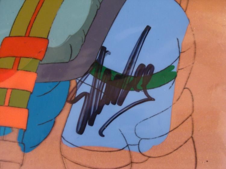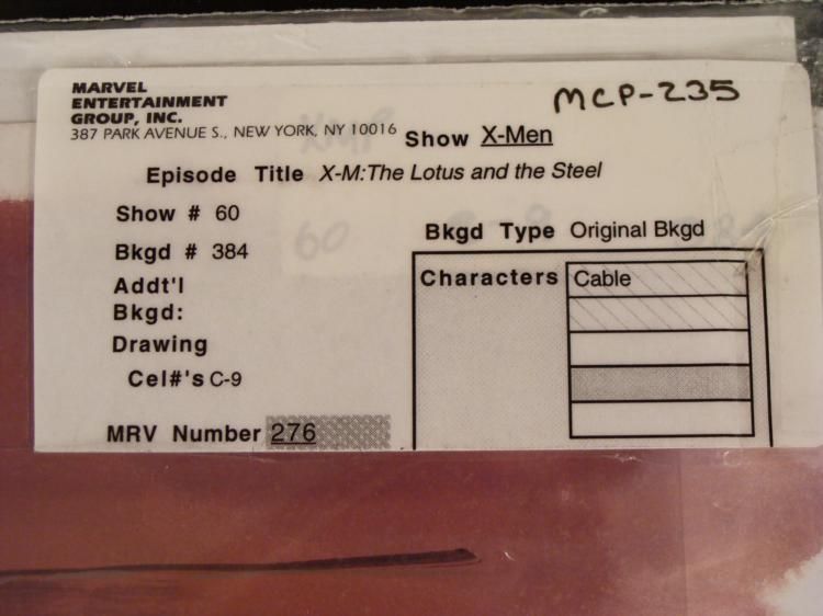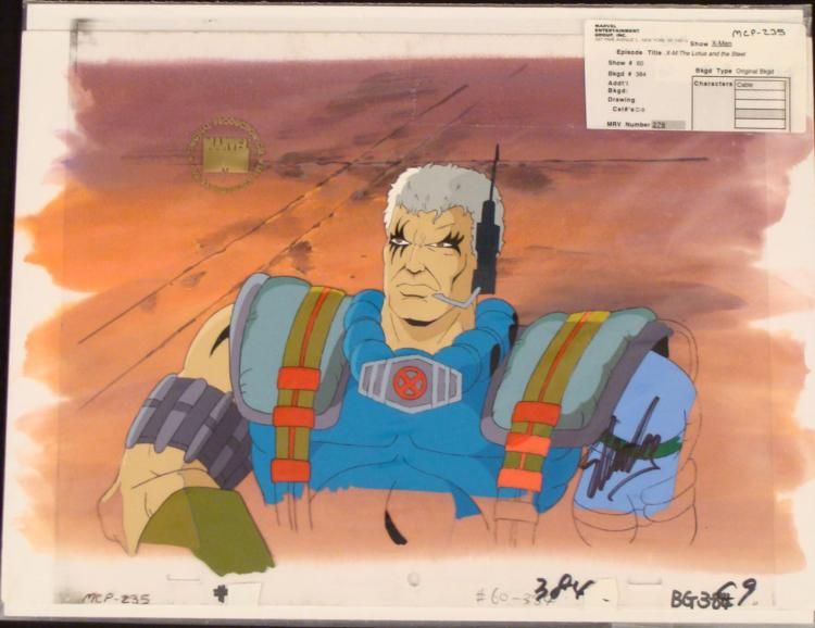 This is an original signed production cel and background from the hit series X-Men. Stan Lee signature is located on the right of cel in black sharpie. * * Under a cloud of increasing anti-mutant sentiment, Professor Xavier creates a haven at his Westchester mansion to train young mutants to use their powers for the benefit of humanity, and to prove mutants can be heroes. Xavier recruited Cyclops, Iceman, Angel, * Beast and Jean Grey calling them "X-Men" because they possessed the "x-gene", an ability normal humans lacked. Early issues introduced the team's arch enemy, Magneto and his Brotherhood of Evil Mutants, who would later battle the X-Men for years. * * IT'S TIME TO RAGE! * * * * * Original Animated Cel & Production BackgroundMedium: Hand painted acetate celDetails: Animation notations and peg holes * * Overall Size of the Cel: 10 1/2" x 12 1/2" * Overall Size of the background: 10 1/4" x 14 1/4" * Excellent Condition * This is an original hand-painted cel set-up used in the production of an episode of X-Men titled "The Lotus and the Steel." Each one-of-a-kind set-up represents a slight change in position of the characters. When individually photographed and projected * in rapid succession, the images appear to move. * * To create production cels, the original animator's drawing is transferred onto an acetate cel (by hand-inking and/or photo copying). The cel is then hand-painted on the reverse side. The background accompanying this set-up is an original production background. * * * The cel and original background is ready to be matted and framed. The animators notations are located at the bottom of the cel and background. The Marvel Seal is located at the top right of the cel. The cel * and background are in a protective sleeve. An information card about the episode is located at the top right of the protective sleeve. *