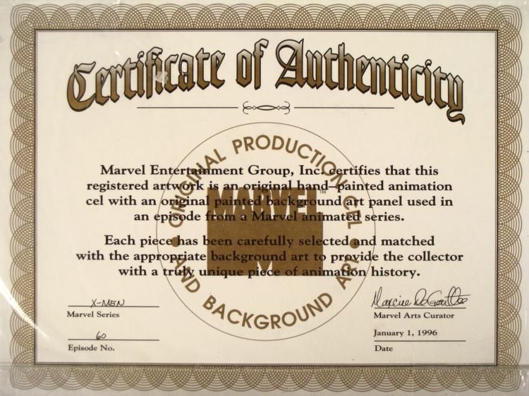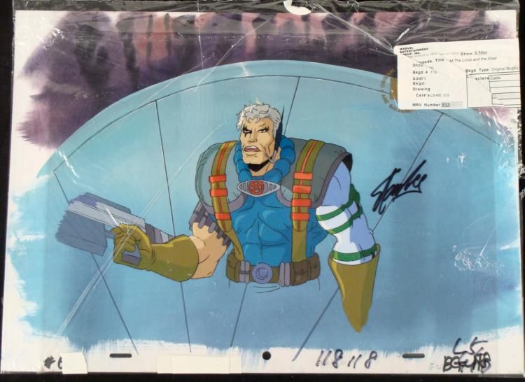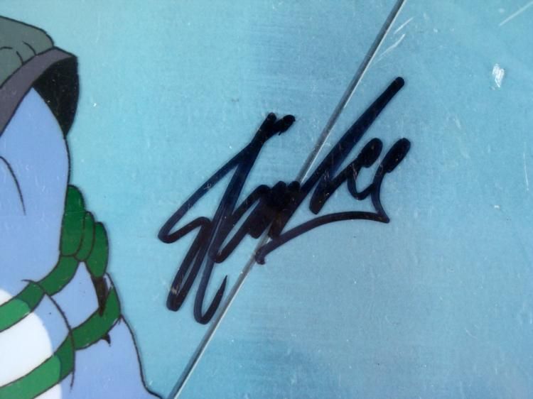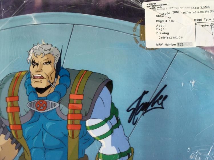 This is an original signed production cel and background from the hit series X-Men. Stan Lee signature is located on the right of cel in black sharpie. * Under a cloud of increasing anti-mutant sentiment, Professor Xavier creates a haven at his Westchester mansion to train young mutants to use their powers for the benefit of humanity, and to prove mutants can be heroes. Xavier recruited Cyclops, Iceman, Angel, Beast and Jean Grey calling them "X-Men" because they possessed the "x-gene", an ability normal humans lacked. Early issues introduced the team's arch enemy, Magneto and his Brotherhood of Evil Mutants, who would later battle the X-Men for years. * COME GET SOME!!! * Original Animated Cel Overall Size of the Cel: 10 1/2" x 12 1/2" Overall Size of the background: 10 1/4" x 14 1/4" Excellent Condition This is an original hand-painted cel set-up used in the production of an episode of X-Men titled "The Lotus and the Steel." Each one-of-a-kind set-up represents a slight change in position of the characters. When individually photographed and projected in rapid succession, the images appear to move. * To create production cels, the original animator's drawing is transferred onto an acetate cel (by hand-inking and/or photo copying). The cel is then hand-painted on the reverse side. The background accompanying this set-up is an original production background. * The cel and original background is ready to be matted and framed. The animators notations are located at the bottom of the cel and background. A ceritificate of Authenticity from Marvel is on the back of background. The Marvel Seal is located at the top right of the cel. The cel and background are in a protective sleeve An information card about the episode is located at the top right of the protective sleeve. *