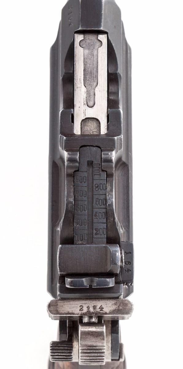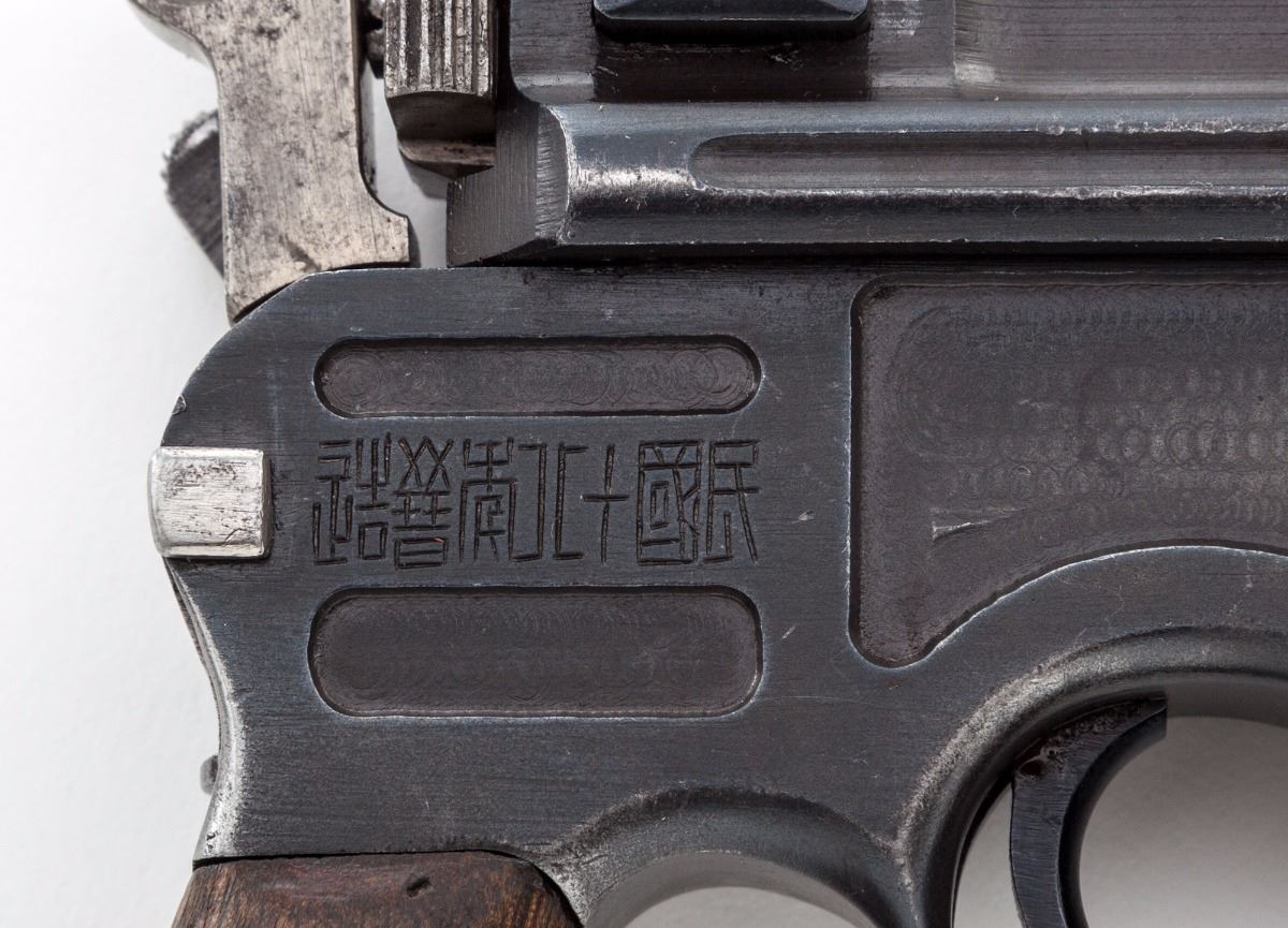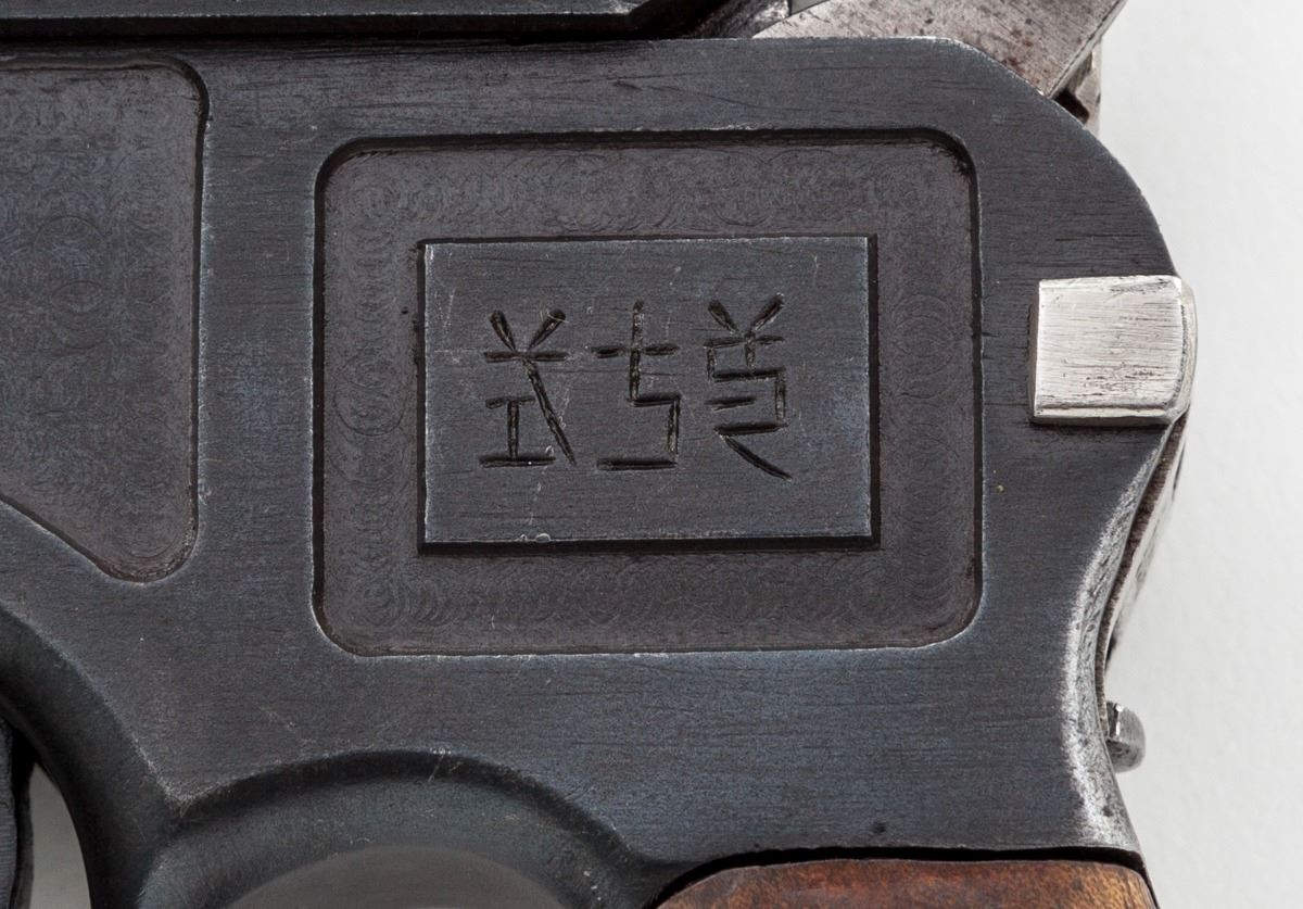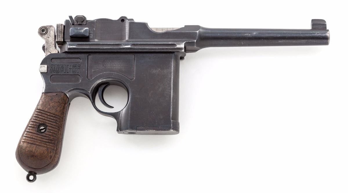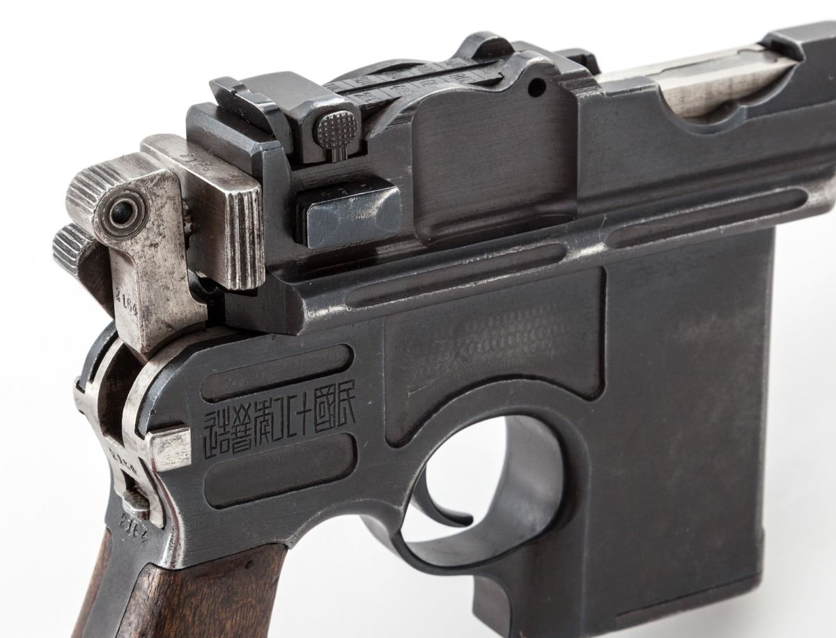 Original Shansei Arsenal Model 96 Semi-Automatic Pistol, #2164, .45 ACP cal., 5-1/2'' barrel, matte blue finish, 14-groove mahogany grips, rear sight calibrated from 100 to 1000 yards. With approx. 8000 mfg'd in 1929, this Broomhandle variant is seldom seen today. Since a great deal of Thompson sub-machine guns were already in service with the Chinese, it is not surprising that the Chinese should chose to copy the standard Broomhandle in .45 ACP. Included with this lot is an extremely rare box of Chinese .45 ACP ammo, dated Feb. 1937. Condition: Pistol remains in excellent condition with all visible matching serial numbers and no import markings. Approx. 95% of its original finish is retained. Grips with light knackering and some oil darkening. Action is crisp with light pitting to top area of crown; bore is very good to near fine with light frosting in the grooves. Est.: $5,000-$7,500. (C&R/PPT)