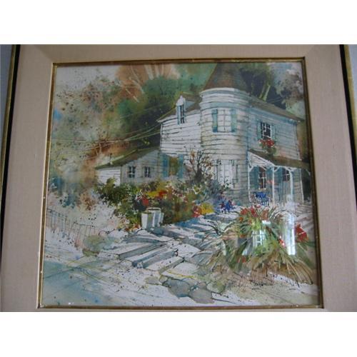 this painting is signed by Listed Artist Marilyn Symandle with its original frame. Marylin Symandle is a California Plein - air painter. She is a member of the Oil Painters of America and the American watercolor society. her studio is in Santa Ynez, California. her specialty is water color! the painting is gorgeous! her information is on Ask art as well as art price. the painting is in excellent condition, with wonderful colors and beautiful subject. the title is "Hometown" and reads in the back of the painting. it has its original sticker which is a bit worn out, two stickers to confirm. it also has writing on the back of the frame which is not legible. this painting has been part of our private collection for years. it is magnificent and in great condition, with normal wear and tear, imperfection chips on the frame not the painting. the painting is covered with glass and has its original frame with few nicks on the frame. Marilyn Symandle received many awards and medal such as High winds medal, and Shiryl Smithsonian Memorial Award in 1999. she has had over 80 one woman shows throughout the United States.