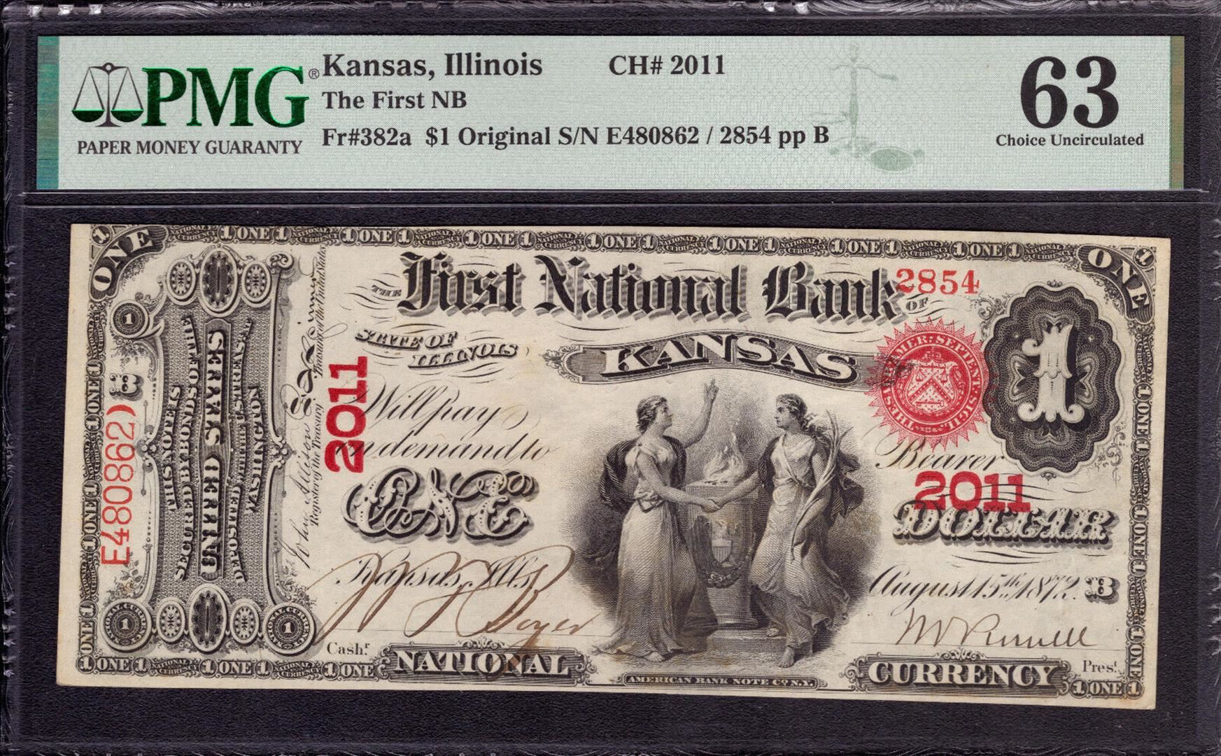 Original $1 The First National Bank Kansas, IL CH# 2854 Note PMG Ch. Uncirculated 63
