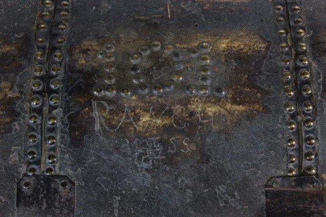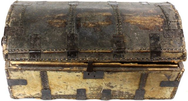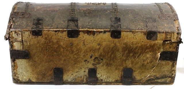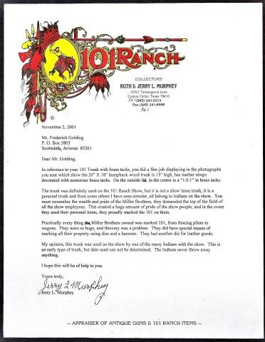 in cowhide and tacked decorated, 101 on the top. Trunk shows wonderful old patina, hair rubber off to top, heavy use as expected, letter from appraiser and 101 Ranch Collector Jerry Murphy states the truck was most likely unused by one of the Indians in the show. A great old west collectible, 17" X 18" X 35". Est. 600-1200