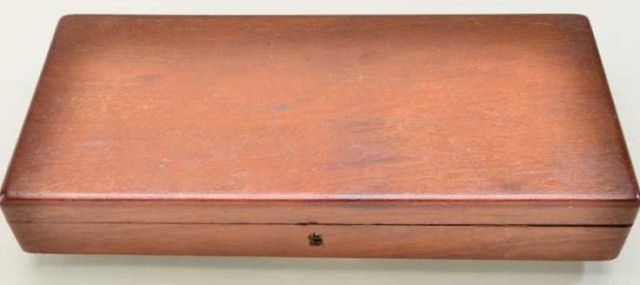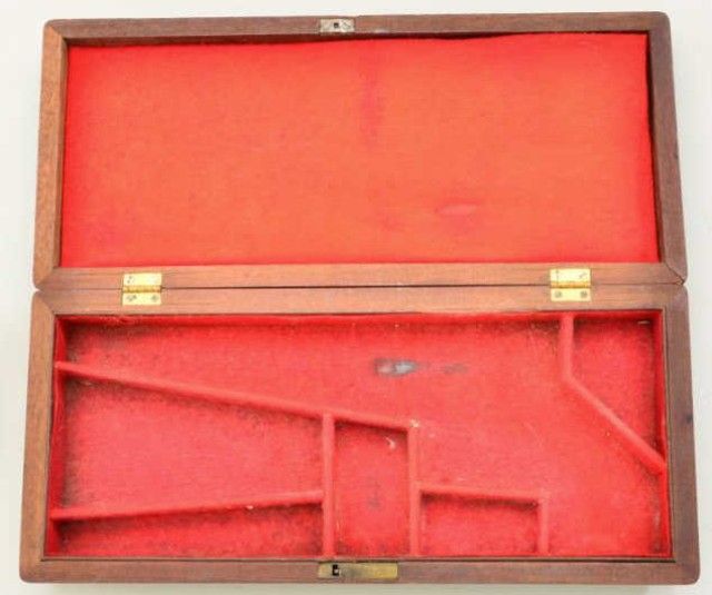 Original 1862 Police casing for 6-1/2” barrel with partition style interior configured for Thuer conversion or extra cylinder. The interior of the case is lined in red baize which is correct for the late percussiontransition to cartridge era. The exterior of the case is in good condition with some light scratching, normal aging. The interior of the case shows some stains, impressions, minor fading and fraying and is at lease very good plus. John R. Gangel obtained this case from Johnny Bassett in the early 1980’s in a trade on a Walker pistol and at that time the case contained an 1862 police Thuer conversion engraved with extra cyl which wasin fine condition. Little John sold the set in the mid 1980’s to a local collector who in turn sold it to a major collector in NYC. The New York collector sold it at Butterfields in the late 1990’s at auctionwhere re-purchased by JRG. The case was separated and this exact pistol is pictured in the Dr. Joseph Murphy collection with a different case. A very rare original late percussion to cartridge era case that is