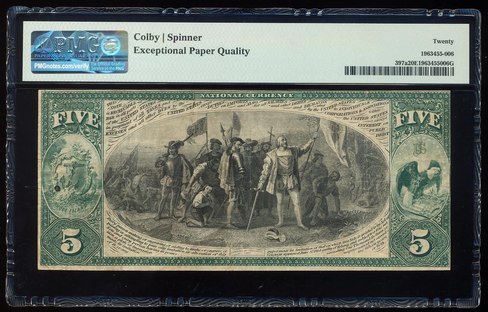 Original 1865 $5 Rhode Island Providence, RI CH# 983 National Note PMG VF 20EPQ