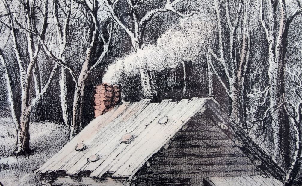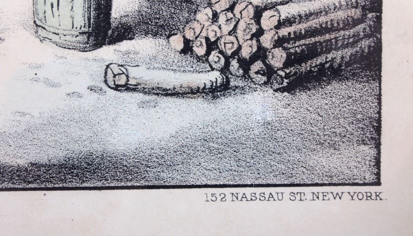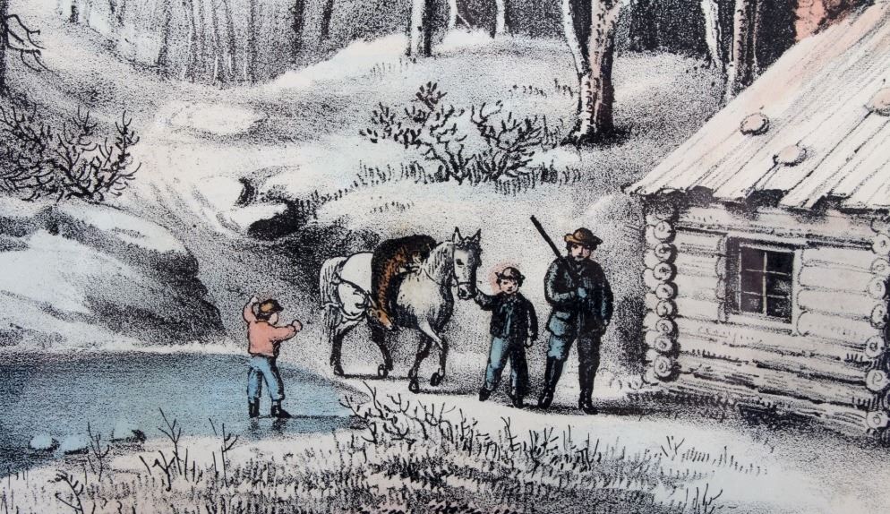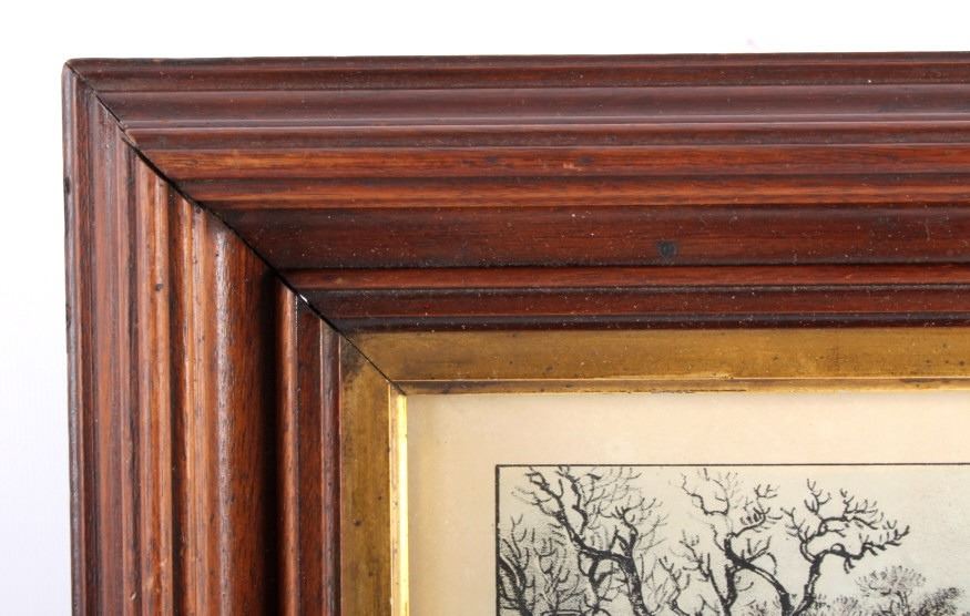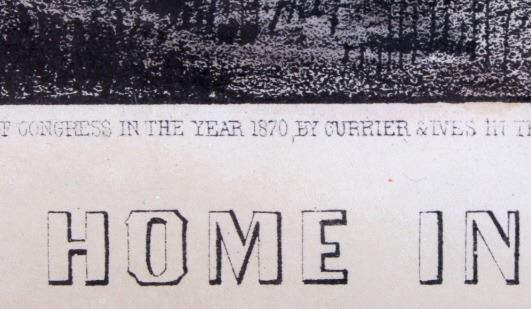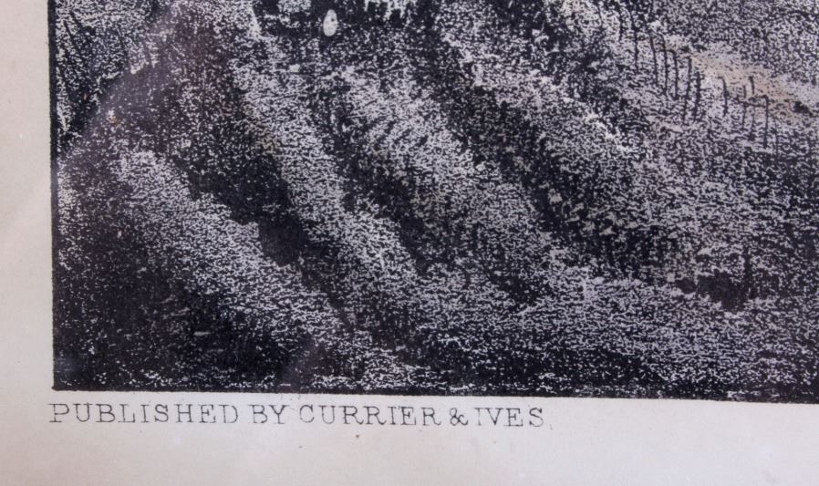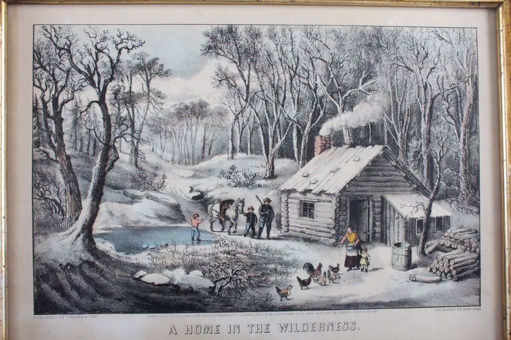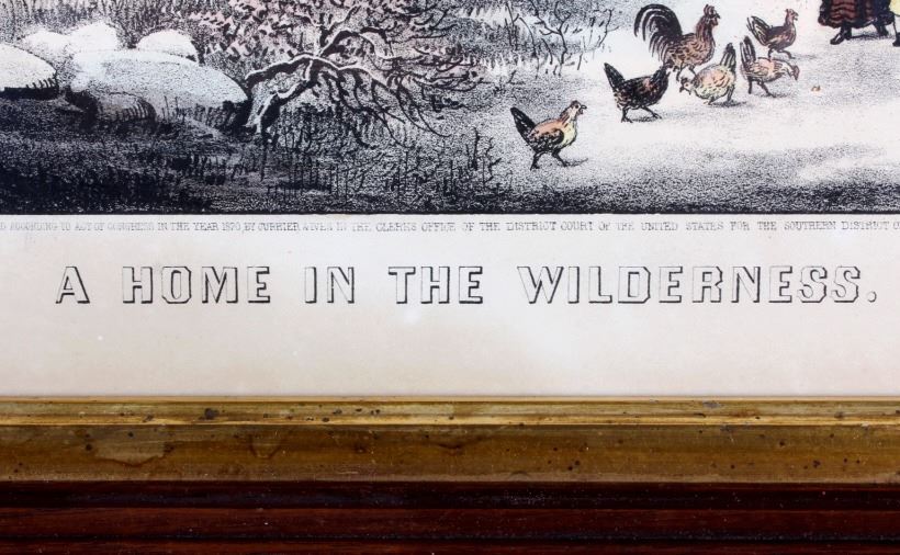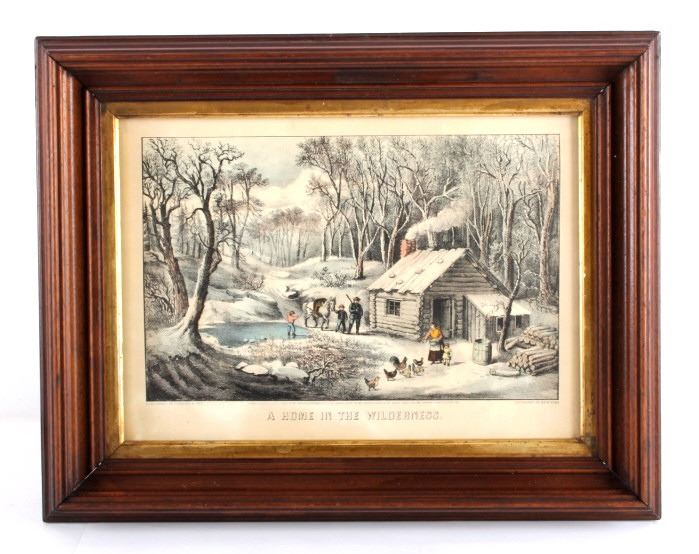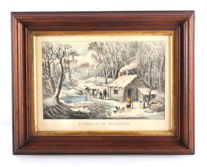 This is an original Currier & Ives hand tinted lithograph titled "A Home in the Wilderness" from 1870. Nathaniel Currier and James Merritt Ives were founders of the successful printmaking firm in New York City from 1857-1907 called The Grand Central Depot for Cheap and Popular Prints. Their lithographs have endured the times and are highly sought after in today's collectible markets. This piece shows a family returning to their homestead after a successful deer hunt. The bottom left corner is marked "Published by Currier & Ives" and the bottom right corner is marked "125 Nassau St. New York". The bottom of the lithograph reads "A Home in the Wilderness". The piece has been professionally framed. The Currier & Ives lithograph is in good condition. The frame measures 14.5" x 18.75".