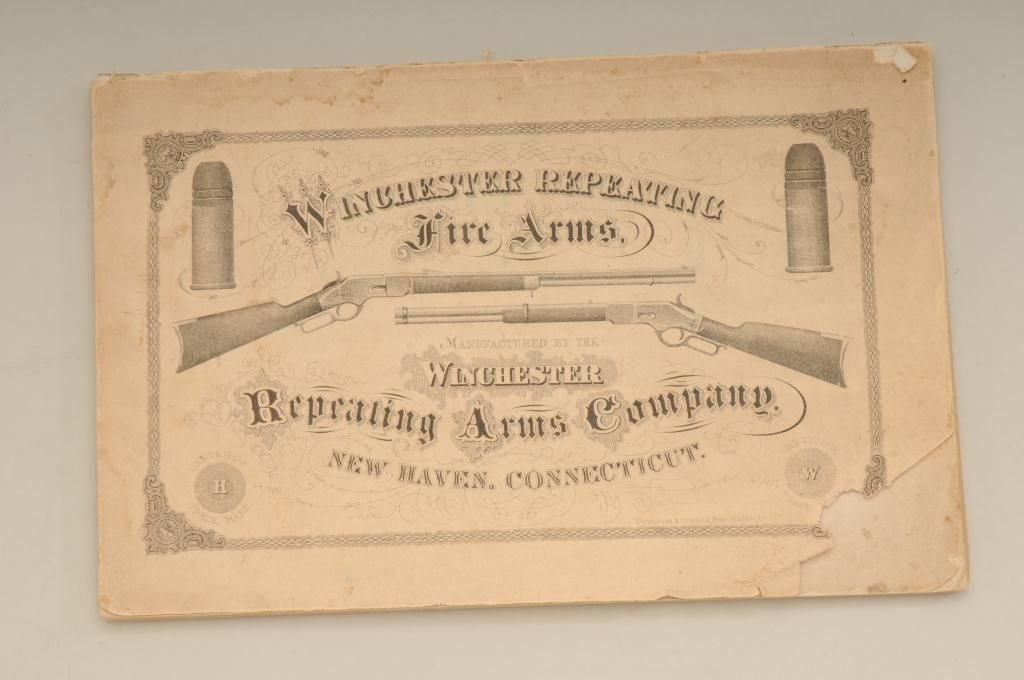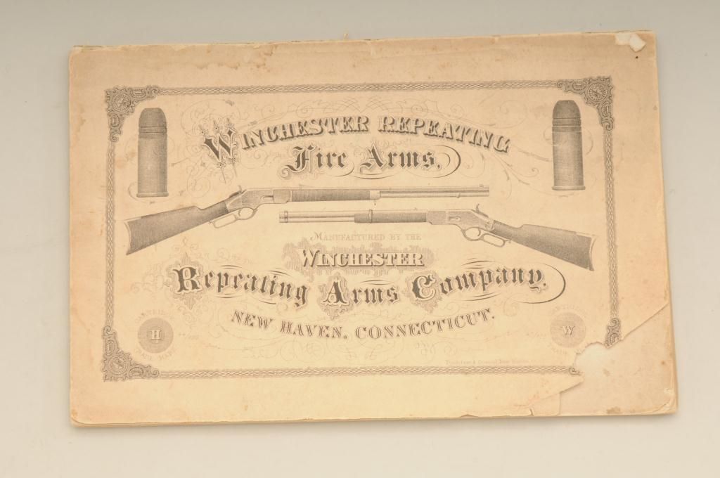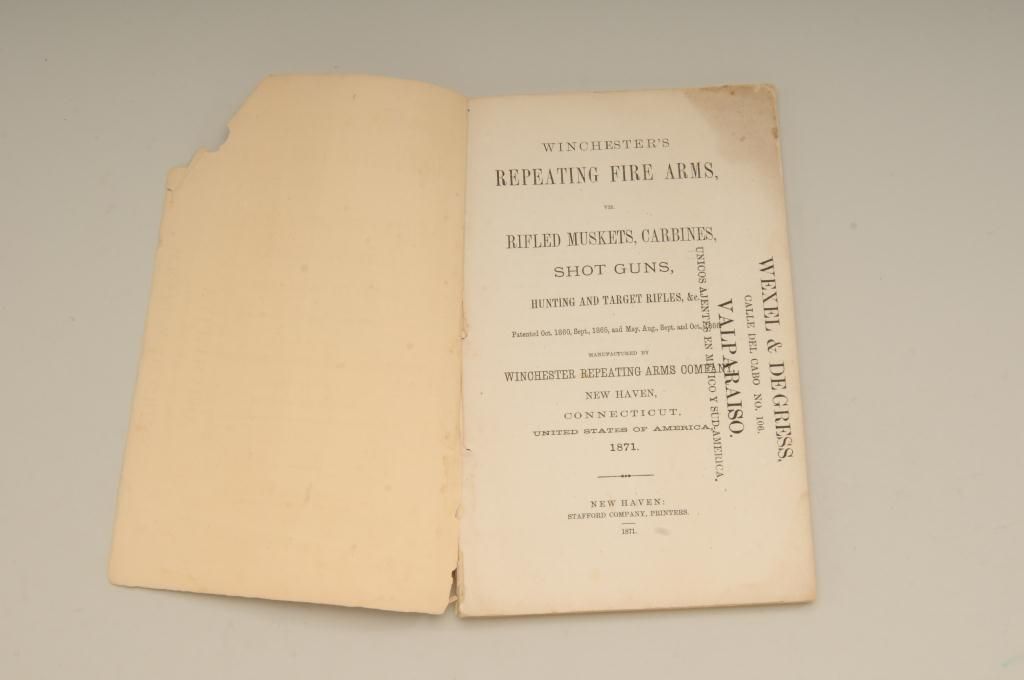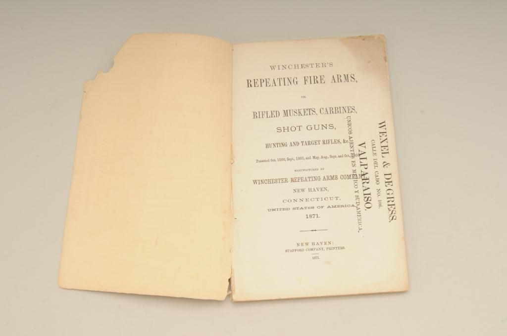 Original 1871 Winchester Repeating Arms Co. 64 page catalog with fold-outs showing the Model 1866 lever action rifle and carbine on the cover and marked inside “Wexel & Degress, Calle Del Cabo No. 106. Valparaiso, UnicosAjentes En Mejico Y Sud America”; in overall good condition with some edge flaking and losses to the cover but not affecting the principle design work. An extremely rare piece of early Winchester ephemera asknowledgeable collectors estimate only approx. a dozen examples of this edition of Winchester catalog exist in collections today. Est.: $1,500-$3,000.