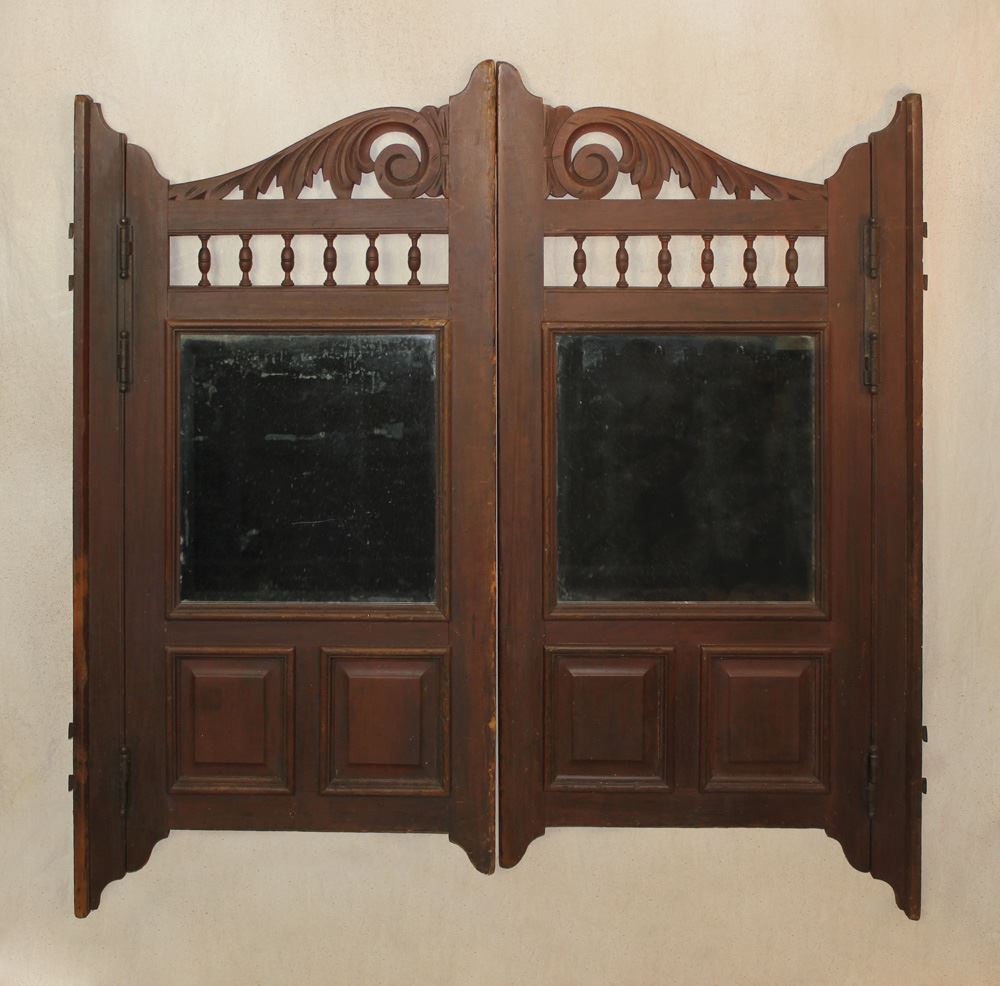 Nice early solid walnut raised panel saloon doors, with decorative spindle tops and full panel beveled mirrors. Still retaining their original two-way hinges. Each door measuring 25"x 46".