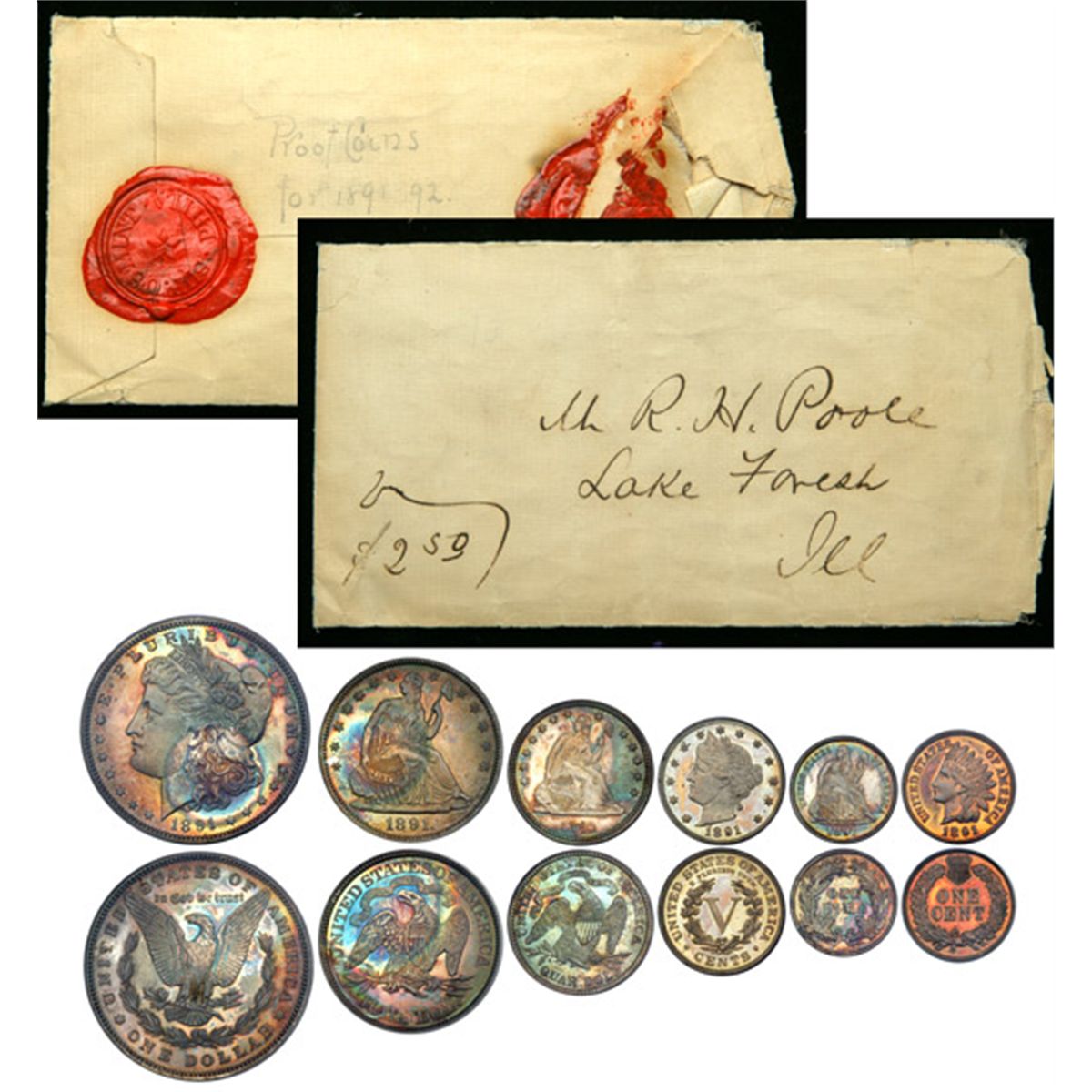 Original 1891 6-piece Proof Set. A beautifully matched set and completely original as issued. The silver coins exhibit wonderful rainbow colors that range all over the map and would provide endless hours of study. This set was just sent to PCGS for grading for the first time and grades as follows: 1¢ PR-64 RB Pop 124; 5¢ PR-65 Cameo Pop 22; 10¢ PR-66 Pop 20; 25¢ PR-65 Pop 27; 50¢ PR-66 Pop 16; $1.00 PR-66 Pop 21.